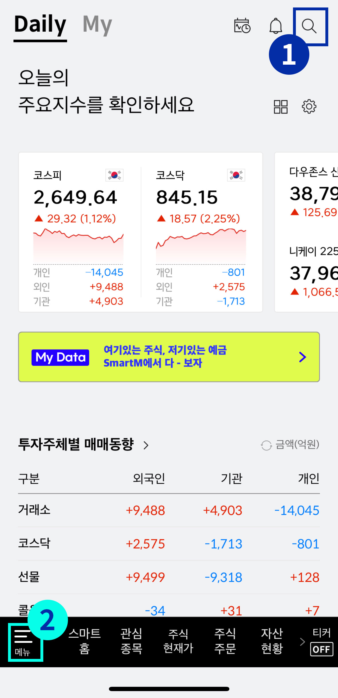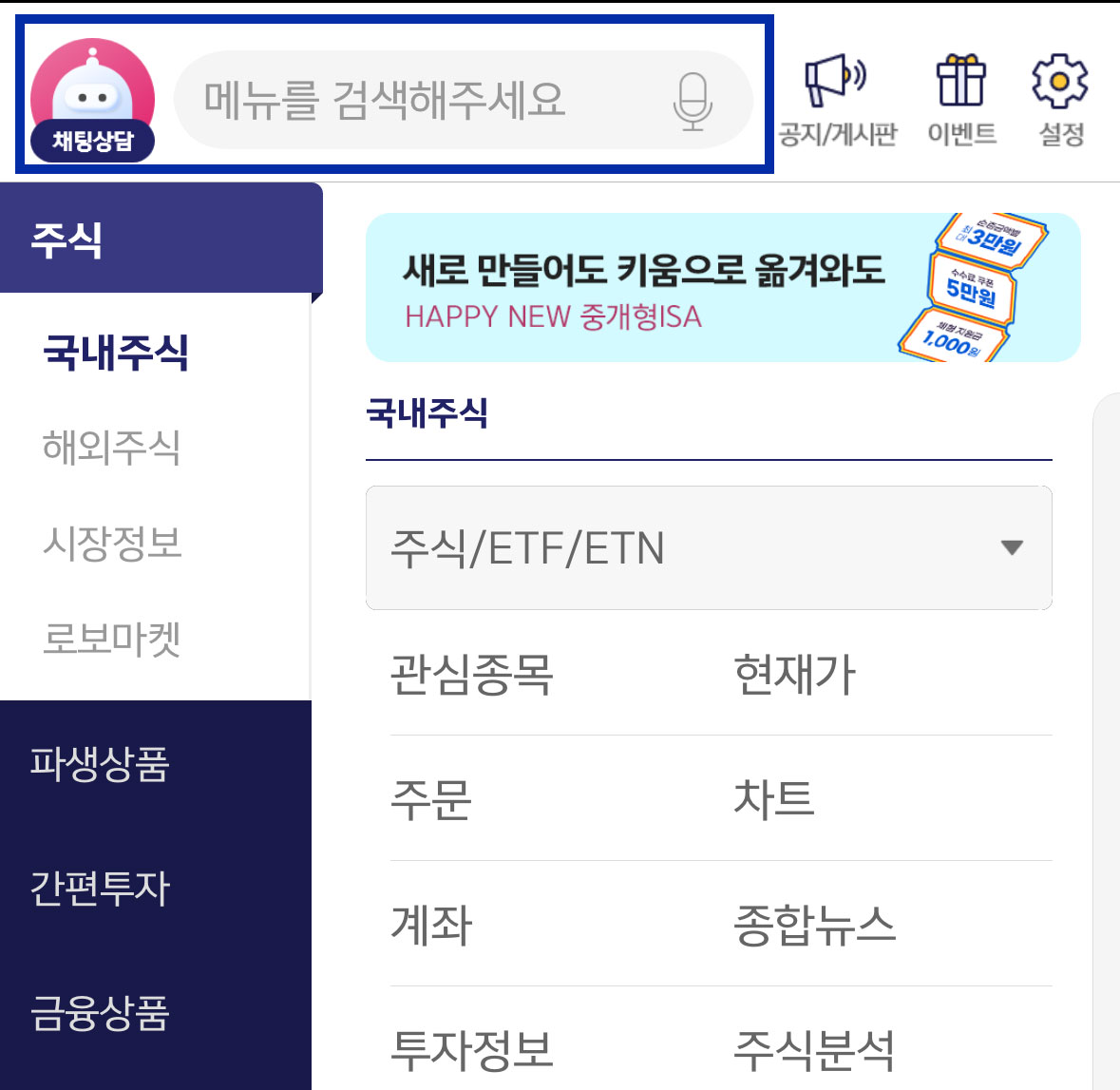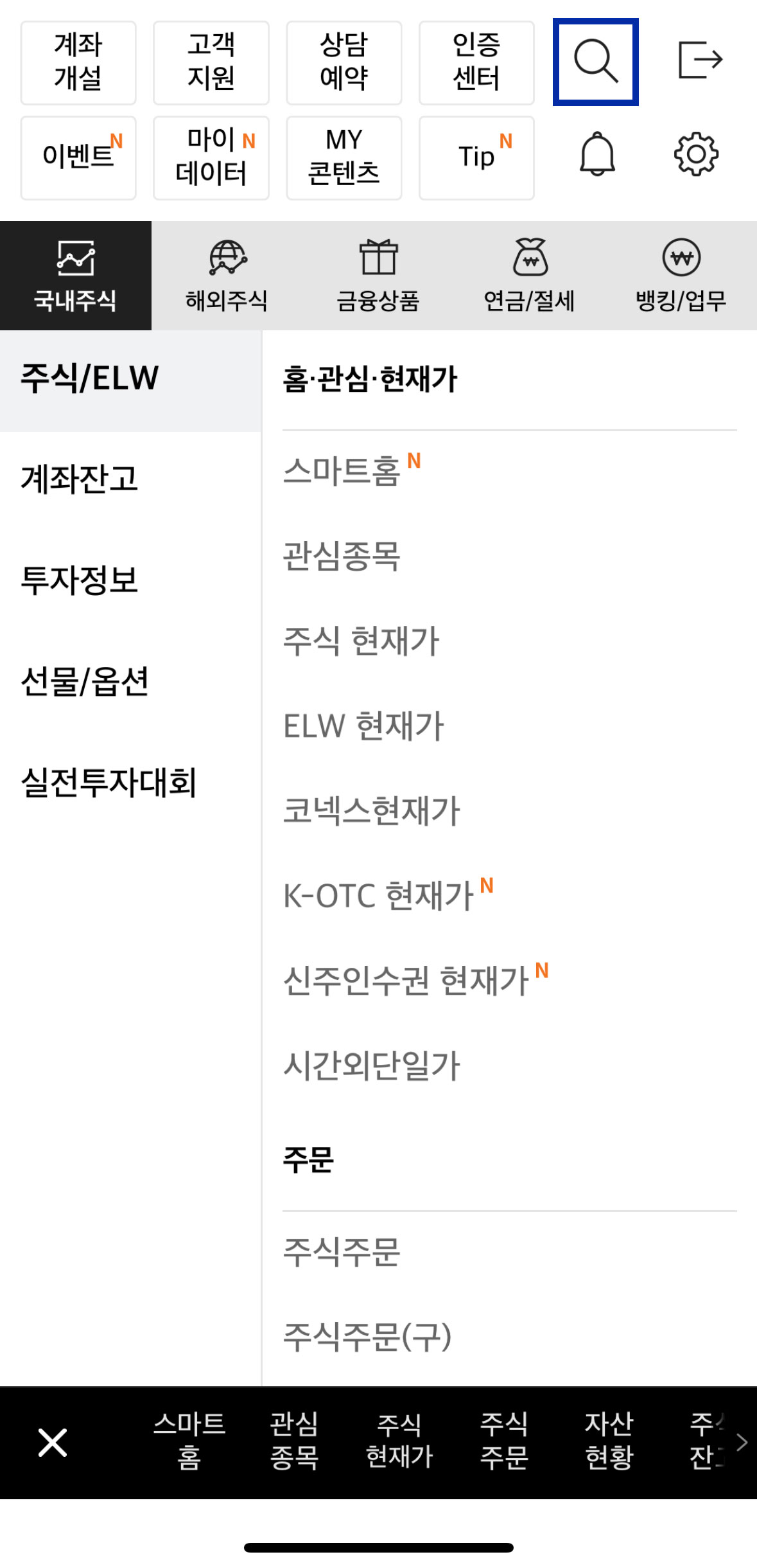 먼저 한화투자증권의 이에이트 공모주를 살펴보겠습니다. 한화투자증권 어플을 켜면 가장 상단에 돋보기 아이콘이 보이고 가장 하단에 메뉴 아이콘이 보입니다. 돋보기 아이콘을 먼저 클릭해 보겠습니다.