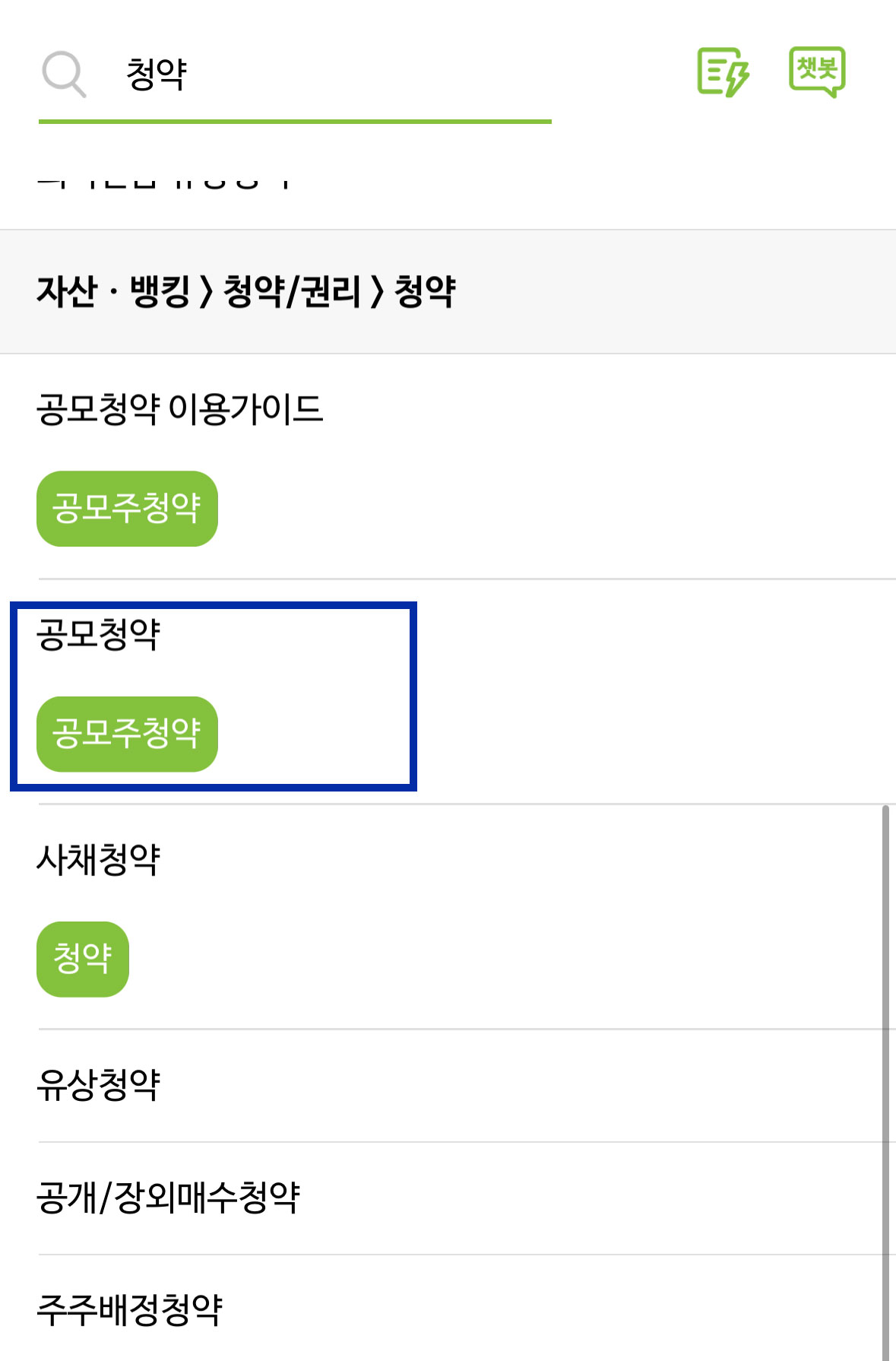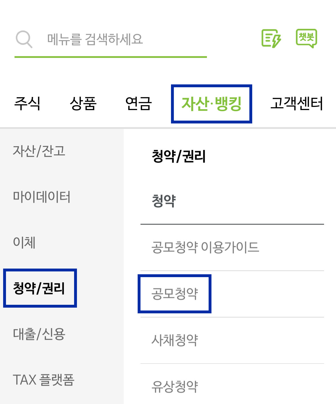 아니면 청약을 검색하지 않고 검색창 아래에 있는 탭 메뉴에서 '자산, 뱅킹' 메뉴를 클릭하시고 왼쪽 메뉴에서 청약/권리를 클릭하신 후 공모 청약을 누르시면 해당 화면으로 전환됩니다. 여기까지 잘 따라오셨다면 다음 이미지로 넘어가 주세요.