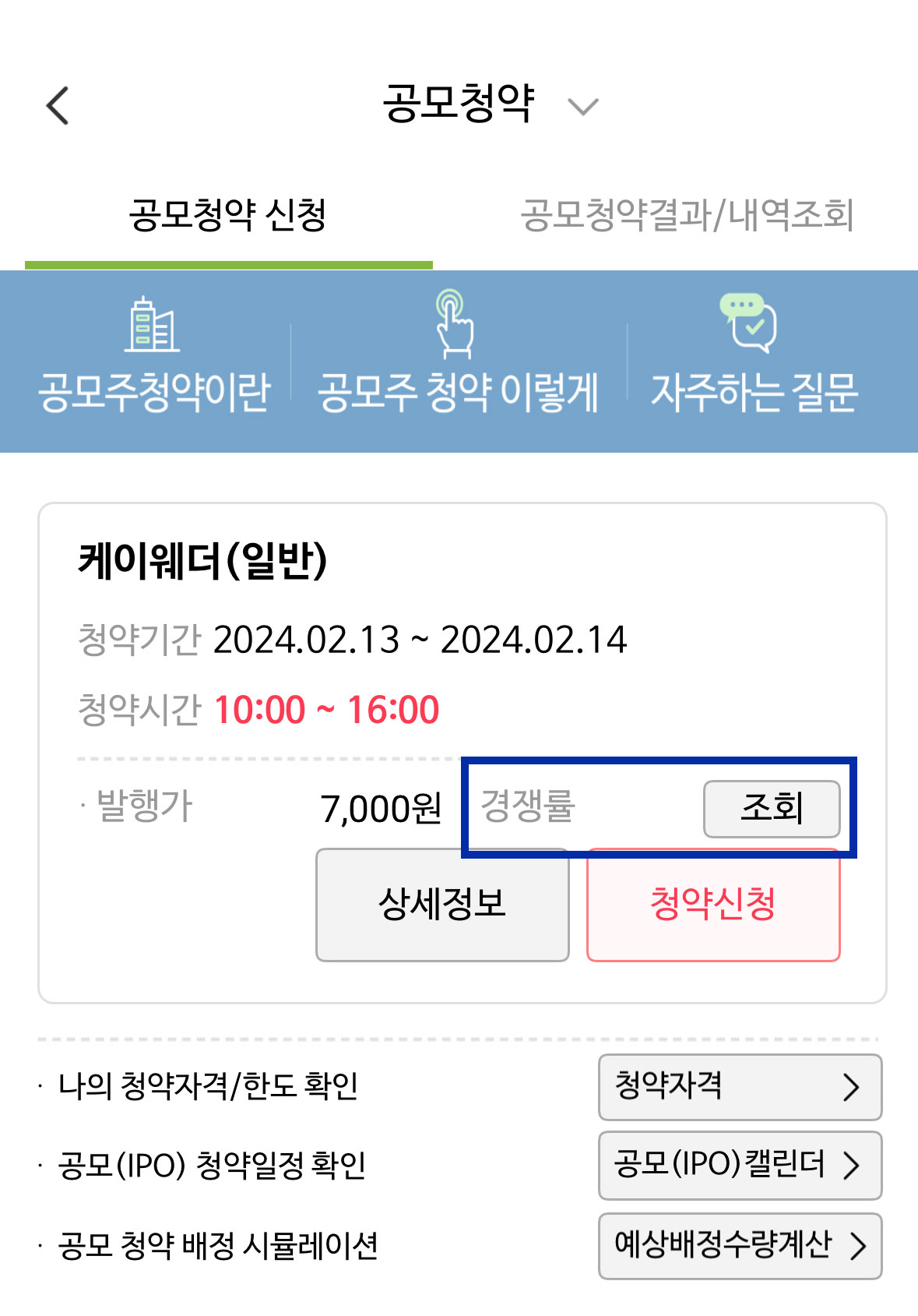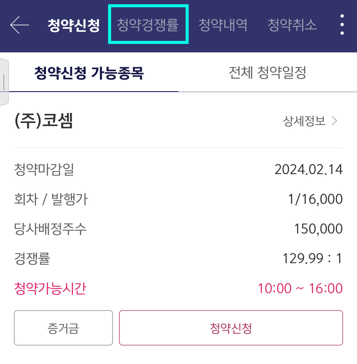 그러면 오른쪽 화면처럼 청약 신청, 청약 경쟁률과 같은 메뉴가 하단에 뜨는 것을 확인할 수 있습니다. 어느 것을 클릭해도 경쟁률을 확인할 수 있는 화면으로 넘어갈 수 있습니다. 두 번째 메뉴인 '청약 경쟁률'을 클릭하면 저희가 확인하고 싶은 코셈 1일 차 경쟁률과 예상 배정 수량을 확인하는 화면으로 바로 갈 수 있습니다.