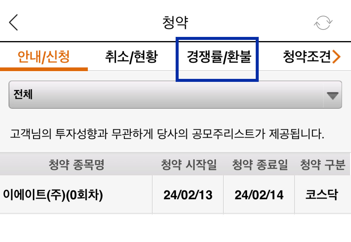 코로나19가 유행일 때 공모주 청약을 많이 했었는데, 그때는 예상 배정 수량을 직접 계산하고 비례 배정으로 1주를 받으려면 얼마나 더 넣어야 할까 파악해보고는 했었어요. 근데 이제는 증권사 어플에서 확인가능한 것 같습니다. 이에이트, 코셈, 케이웨더 경쟁률을 살펴보고 1일 차 공모주 균등 예상 배정 수량을 각 주관사 어플에서 확인해 보도록 하겠습니다.