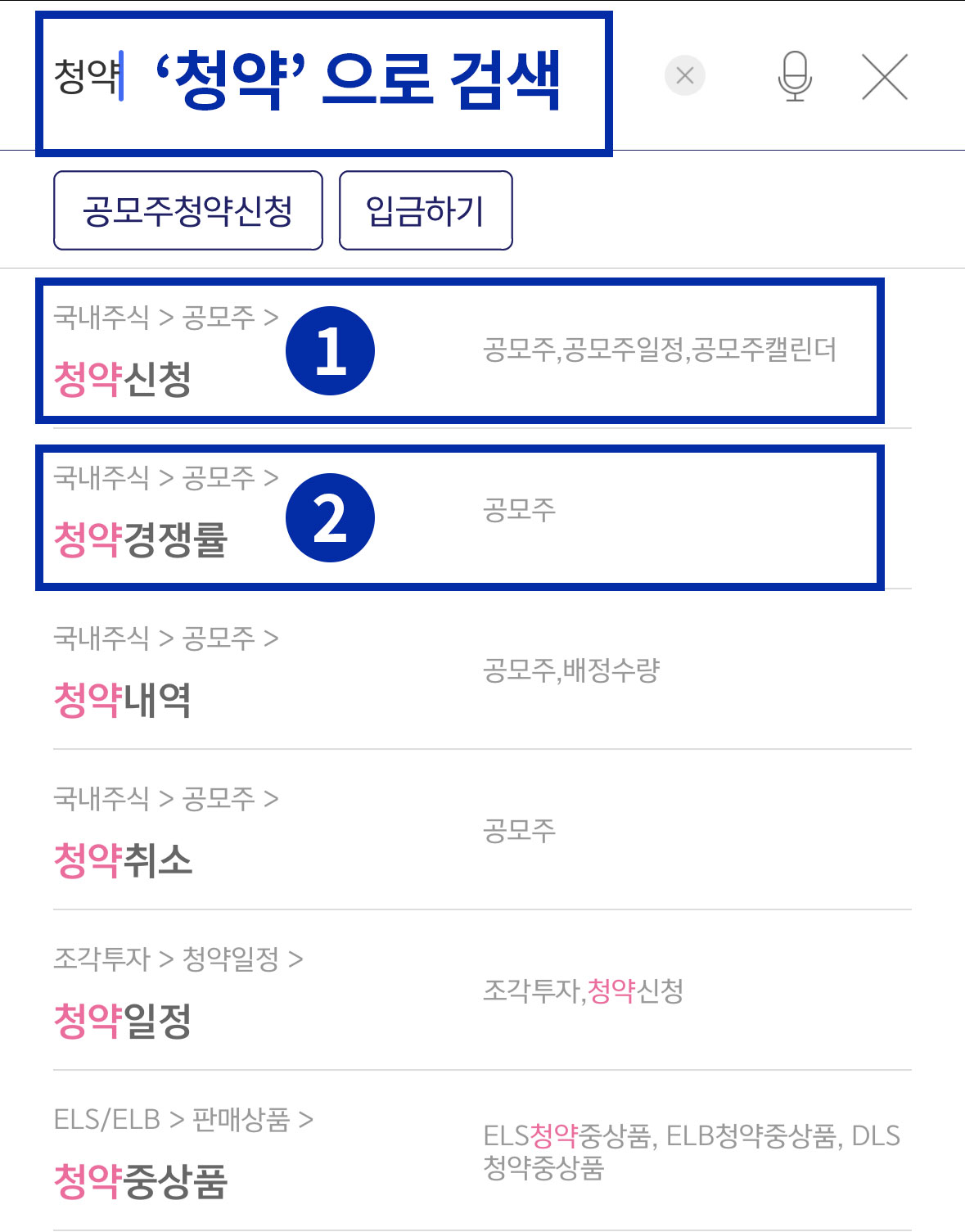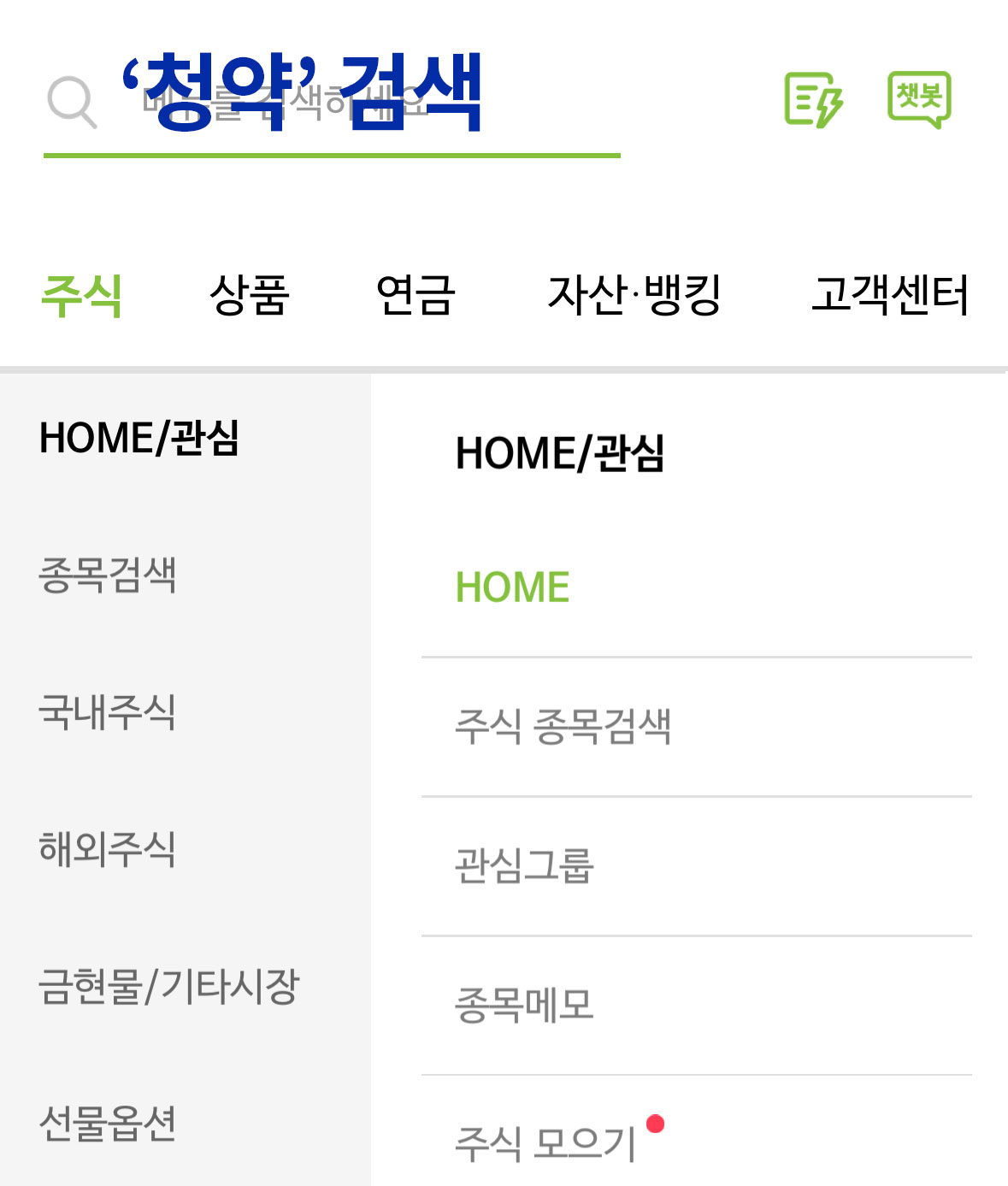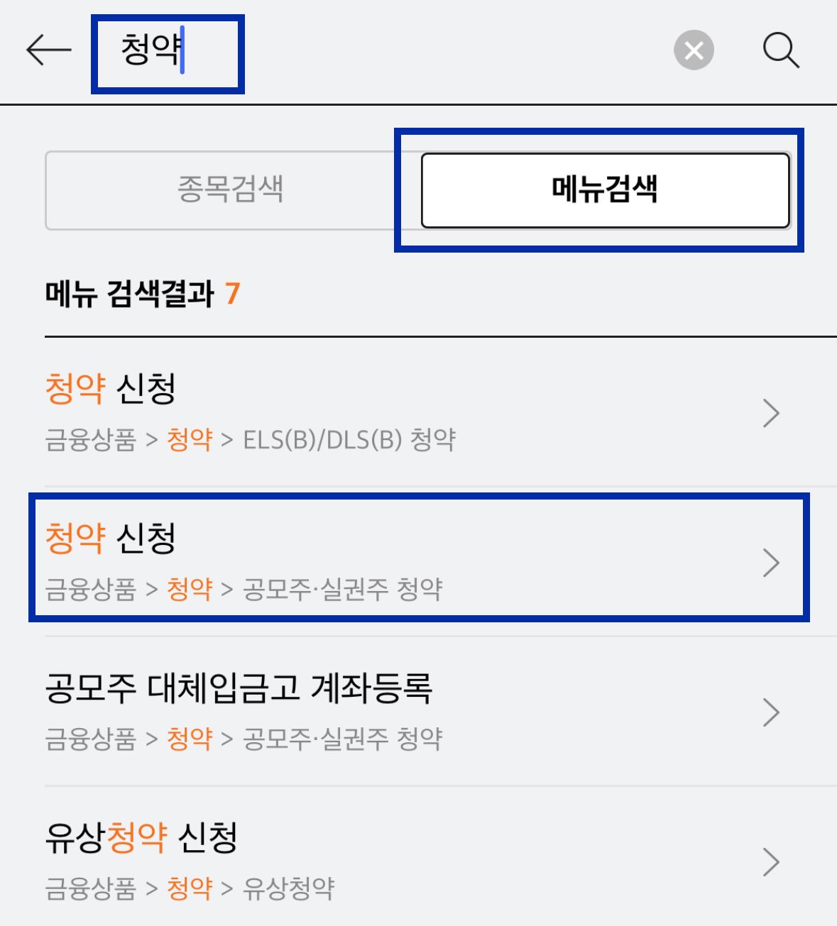 두 번째 이미지가 돋보기 아이콘을 클릭했을 때 나오는 화면입니다. 검색창 아래 탭 메뉴에서 [종목 검색]이 아닌 [메뉴 검색] 탭을 클릭해 주세요. 그리고 '청약'이라고 검색창에 입력하시면 메뉴 검색 결과 두 번째에 '청약 신청'이라는 메뉴가 보입니다. 이 부분을 클릭하면 됩니다.