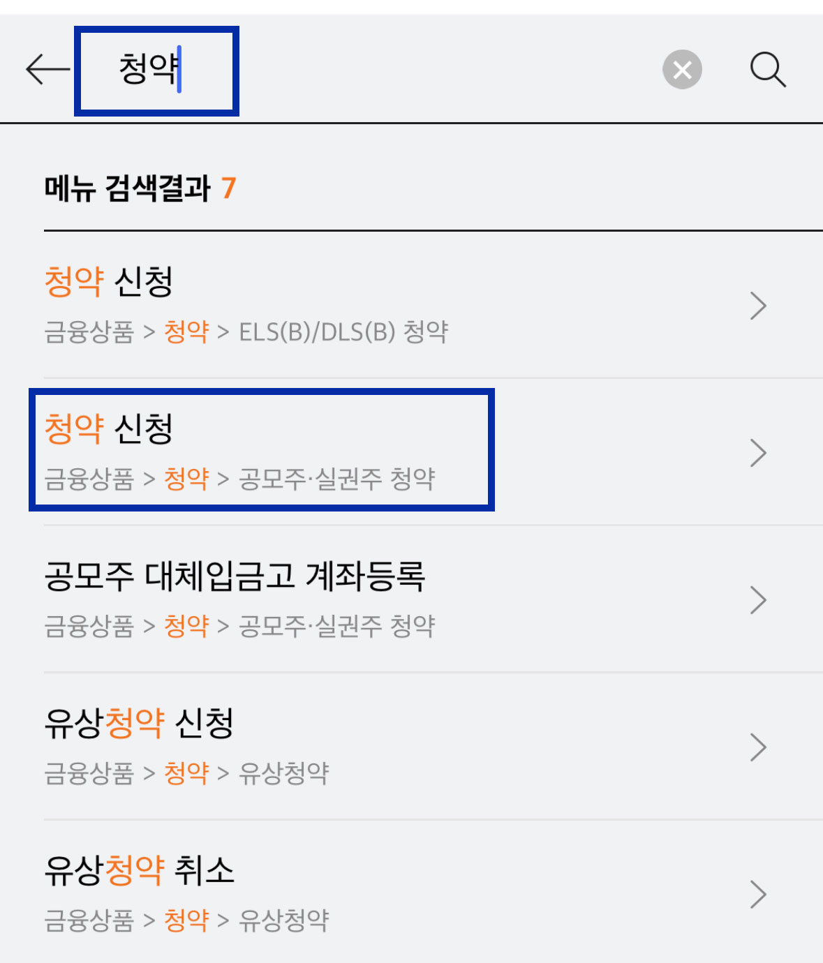 만약에 맨 처음 이미지에서 하단에 있던 메뉴 아이콘을 클릭하면 어떻게 될까요? 위에 보이는 첫 번째 화면이 보입니다. 여기서도 돋보기 아이콘을 클릭해 주면 오른쪽 이미지가 보입니다. 여기서는 탭 메뉴를 클릭할 필요가 없고 바로 '청약'이라고 검색해 주시고 공모주, 실권주 청약 신청에 들어갈 수 있는 메뉴를 클릭합니다.