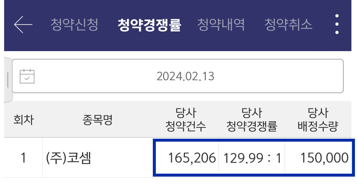 만약 첫 번째에 있던 청약 신청을 클릭하셨다면, 상단에 있는 탭 메뉴에서 '청약 경쟁률' 메뉴를 한번 더 클릭합니다. 그러면 오른쪽 이미지와 같은 화면이 나타납니다. 코셈 공모주는 경쟁률이 아주 치열한 것을 볼 수 있습니다. 당사 배정 수량은 150,000주인데 청약 건수가 벌써 이를 초과한 165,206건이 접수되었습니다.