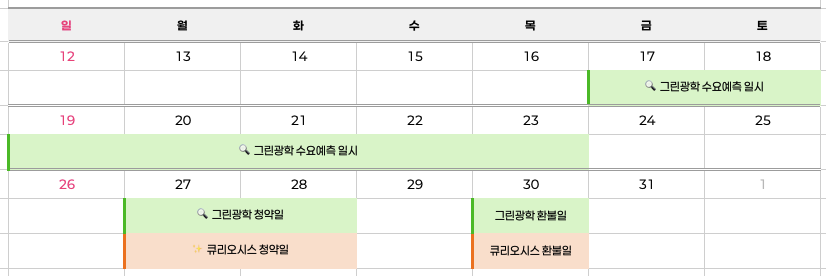 청약일정은 2025년 10월 27일부터 28일까지이며, 큐리오시스 청약일과 중복된다는 점도 유의하셔야 합니다. 수요예측 일시는 10월 17일부터 23일까지 진행됩니다. 24일에는 제가 수요예측 결과와 경쟁률, 의무보유 확약 비율을 확인하여 정리하도록 하겠습니다. 그린광학 공모주 청약에 관심 있는 분들은 수요예측 결과와 시장 상황을 꼼꼼히 살핀 후 청약일정 계획을 세워보시길 바랍니다. 긴 글 읽어주셔서 감사합니다.