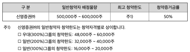 먼저 비례배정 물량을 고려하고 계신 분들을 위해 최고 청약한도에 대해 정리하도록 하겠습니다. 일반 청약자 배정 물량은 500,000주 ~ 600,000주 예정이며 이 수량은 이후 변경될 수 있습니다. 일반 고객과 우대 고객의 청약 한도 비율이 다른데요, 과거 3개월 자산 평가금액이 매일 5천만 원 이상이고 연수입이 30만 원 이상인 고객은 우대고객, 3개월 자산이 매일 1천만 원 이상인 고객은 일반 고객이지만 청약 한도를 200%까지 올려서 청약할 수 있습니다. 위 두 조건 외 고객은 모드 100%까지 청약 가능합니다.