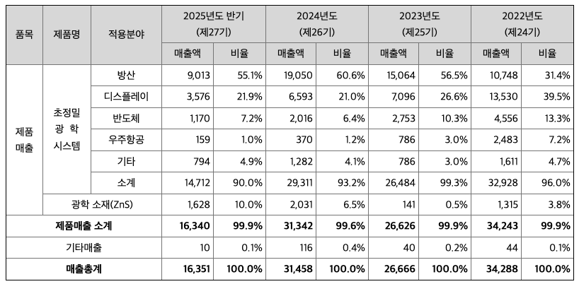 그린광학 공모주는 오랫동안 쌓아온 정밀 광학 기술로 고성능 광학 제품을 시장에 공급하는 광학 전문 기업입니다. 주요 제품 적용 분야에는 방산, 디스플레이, 반도체 그리고 우주항공 등이 있습니다. 방산 쪽이 매출이 50%가 넘는데, 자세히 보면 유도무기가 목표물을 정확하게 찾아갈 수 있도록 눈 역할을 하는 탐색기 장치의 내부 광학계를 제작한다고 합니다. 독보적인 기술력으로 다양한 첨단 산업군에 그린광학의 기술력을 판매하고 있습니다.