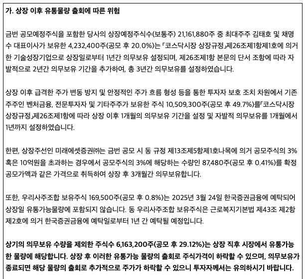 노타 공모주 수요예측결과는 괜찮지만 미확약 비율이 많습니다. 상장 직후 유통 가능 물량도 확인을 해보면 좋은데요, 노타 공모주의 상장일 유통 가능 물량은 29.12%입니다. 상장일에 어느 정도 주가 변동성이 있을 수 있다고 예상해 볼 수 있습니다. 보통 일반 청약자들은 청약 후 빠르게 매도하는 비율이 많습니다.