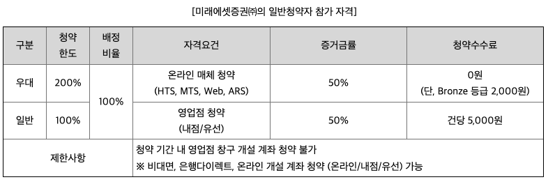 노타 공모주의 대표 주관사는 미래에셋증권입니다. 미래에셋증권에서는 어떻게 청약을 하느냐에 따라서 고객 구분을 다르게 하고 있습니다. 우선 HTS, MTS와 같은 온라인으로 청약을 하는 경우에는 우대 고객으로 분류되고 영업점 청약, 고객 센터를 통한 청약은 일반 고객으로 분류됩니다. 청약 기간 동안 영업점을 통해 계좌 개설을 하면 청약이 불가능하며 아직 미래에셋증권 계좌가 없으시다면 청약이 시작되었으니 비대면 또는 온라인 계좌 개설을 통해 계좌를 개설한 이후에 청약할 수 있습니다. 우대고객과 일반 고객 모두 청약 증거금은 50%가 필요합니다.