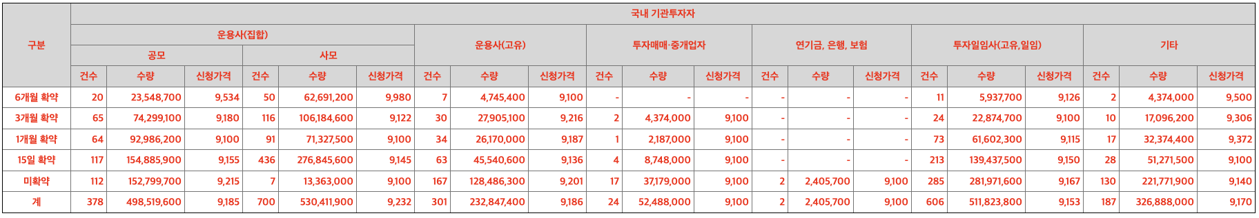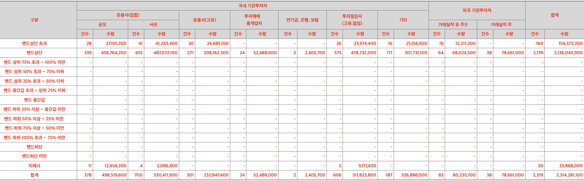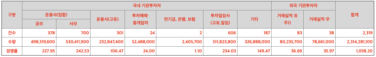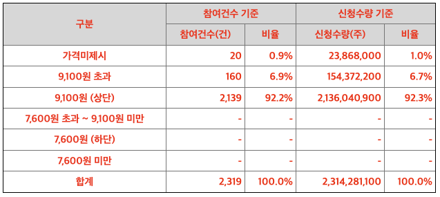 수요예측 신청 가격 분포표입니다. 대부분 밴드 상단을 신청했습니다. 밴드 상단 초과를 써낸 기관도 있었습니다. 가장 아래에 보면 미제시 항목에도 신청건수가 있었다는 것을 알 수 있는데, 이는 금액 상관없이 받겠다는 의미입니다.