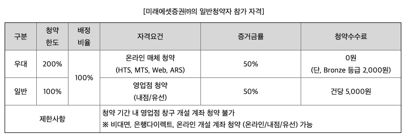 우대 그룹은 청약 한도의 2배까지 청약할 수 있으며, 일반 청약자 배정 물량이 정해지는 대로 다시 한번 정리하도록 하겠습니다. 청약을 하실 때는 청약하고자 하는 금액의 50%의 증거금이 필요합니다. 균등 배정을 받고자 하는 분들이 많아서 최소 청약수량을 기준으로 말씀드리자면, 만약 청약 금액이 7,600원이고 20주를 청약하려고 한다면 7,600원*20주*50% = 76,000원이 청약하고자 하는 계좌에 들어있어야 합니다.
