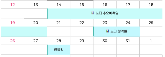 현재 공고된 일반 청약자의 청약일정은 10월 23일(목)~10월 24일(금)입니다. 균등 배정을 하시는 경우 어느 날짜에 해도 크게 상관은 없을 것 같습니다. 다만 주의해야 할 점은 최소 공모주 청약 수량이 20주라는 점입니다. 비례 배정 물량을 노리는 경우 노타 청약일 근처에 있는 다른 공모주 청약 일정도 확인하고 결정하시는 편이 좋습니다. 공모주 청약 일정이 중요한 이유가 비례 배정을 노리고 가진 금액을 모두 한 곳에 넣었을 경우 오히려 더 괜찮은 공모주의 물량을 못 받을 가능성이 있기 때문입니다. 그리고 비례 배정을 할 경우 마지막 날에 청약 경쟁률을 확인하고 내가 어느 정도 금액을 넣어야 가장 효율적인지 체크를 한 후에 들어가는 것이 좋기 때문에, 알람 같은 걸 미리 해두시면 좋습니다.