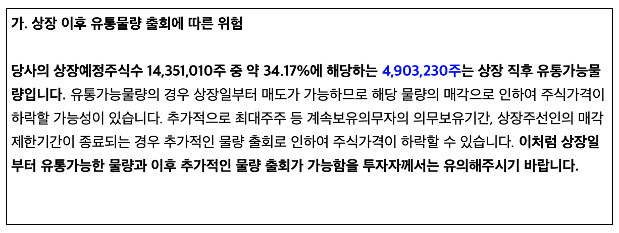마지막으로 기타 유의사항입니다. 더핑크퐁컴퍼니 공모주는 환매청구권이 없습니다. 또한 상장 당일에 유통 가능 물량이 34.17%입니다. 보통 환매청구권이 없는 경우가 많고, 유통 물량도 평균 정도입니다. 그래도 적은 편은 아니기 때문에 상장일에 어느 정도 주가의 변동성이 생길 수 있습니다.