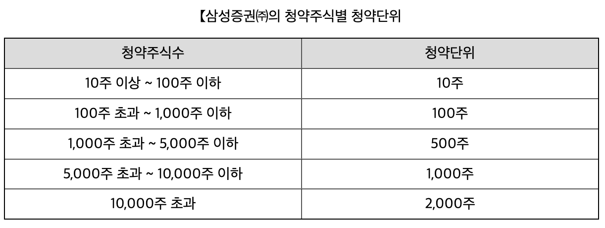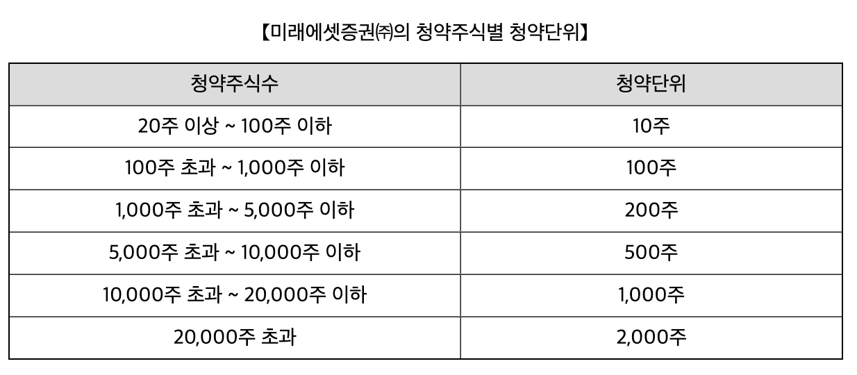 다음으로 청약 단위입니다. 청약 단위는 비례 배정을 하는 경우 중요하게 봐야 하는 부분입니다. 물론 있는 자금을 다 넣어도 되지만 어느 정도 계산을 하면 1주당 필요한 금액이 나오기 때문에 자금을 효율적으로 사용할 수 있습니다. 미래에셋증권은 최소 청약 수가 20주부터입니다. 100주 초과~1,000주 이하인 경우 청약 단위는 100주, 1,000주 초과 ~ 5,000주 이하인 경우에는 200주 이렇게 삼성증권보다는 청약 단위가 세분화되어 있습니다. 삼성증권은 10주부터 청약이 가능하다는 것이 소액 투자자에게는 장점인 것 같습니다. 1,000주 초과 ~ 5,000주 이하인 경우에는 500주 단위로 청약 가능합니다. 더핑크퐁컴퍼니 공모주 청약 마지막날에 경쟁률을 확인한 후 1주당 필요한 금액을 계산해 보도록 하겠습니다.