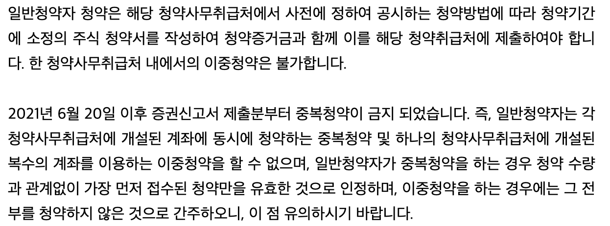 이제 많은 분들이 아시겠지만, 혹시 초보 투자자분이 계실 수 있을 것 같아서 말씀드립니다. 주관사가 두 곳 이상인 경우에는 각각 증권사마다 청약을 할 수 있는 게 아니라 증권사 한 곳을 통해서만 청약할 수 있습니다. 어려운 말로 이중 청약, 중복 청약 금지라고 하는데요, 일반 청약자가 두 곳에 청약을 하는 경우 먼저 청약한 곳만 인정되니 유의해야 합니다.