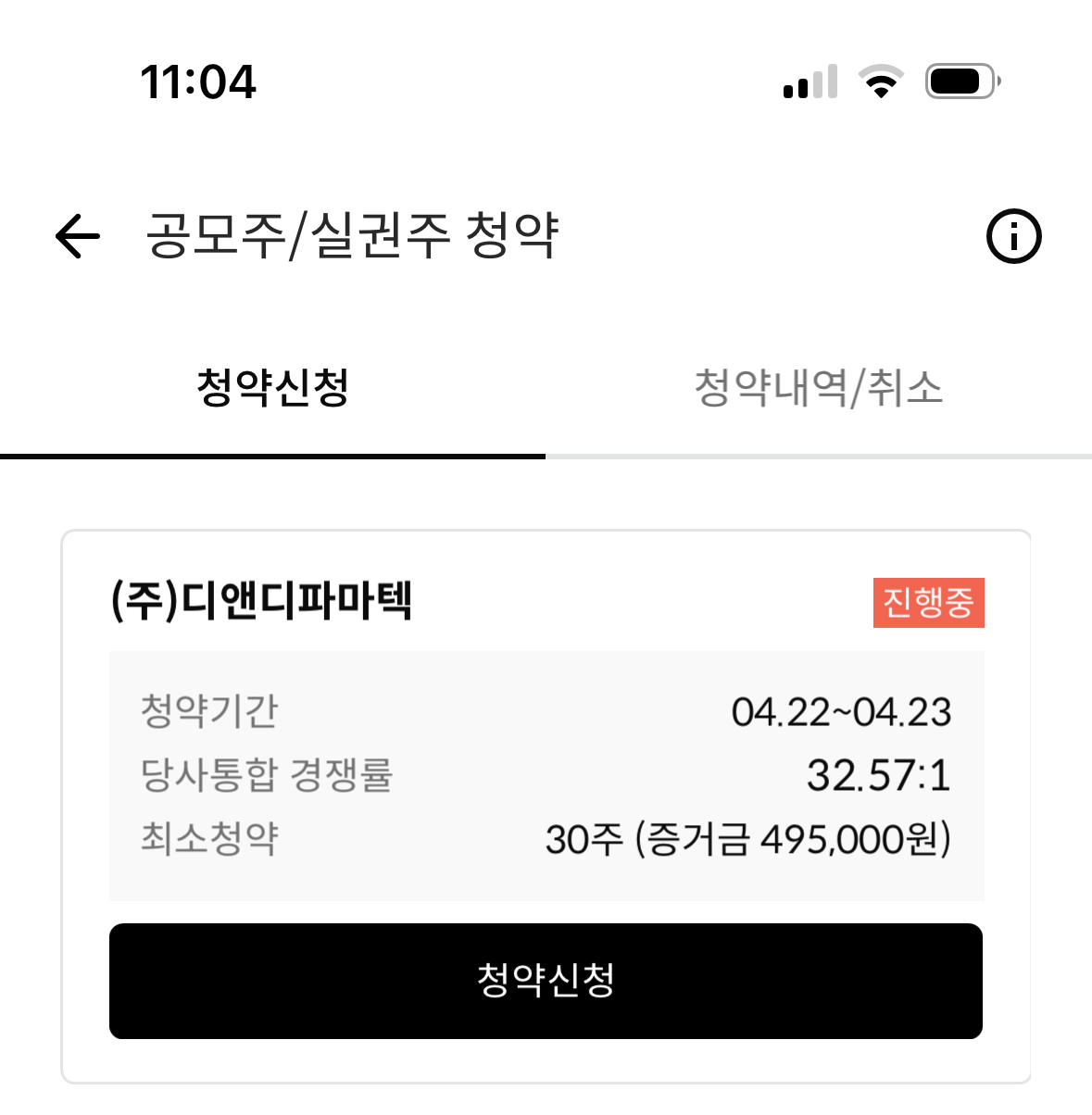 또 하나 특이한 점은 최소 청약수가 30주로 보통 10주, 많아야 20주를 청약해야하는 다른 공모주와 다르게 많은 수량을 청약해야했습니다. 그래서 균등 배정만 하는데도 꽤 많은 청약 증거금이 필요했습니다. 이제 디앤디파마텍 공모주 균등 배정 및 경쟁률을 확인하는 방법에 대해서 알아보도록 하겠습니다.