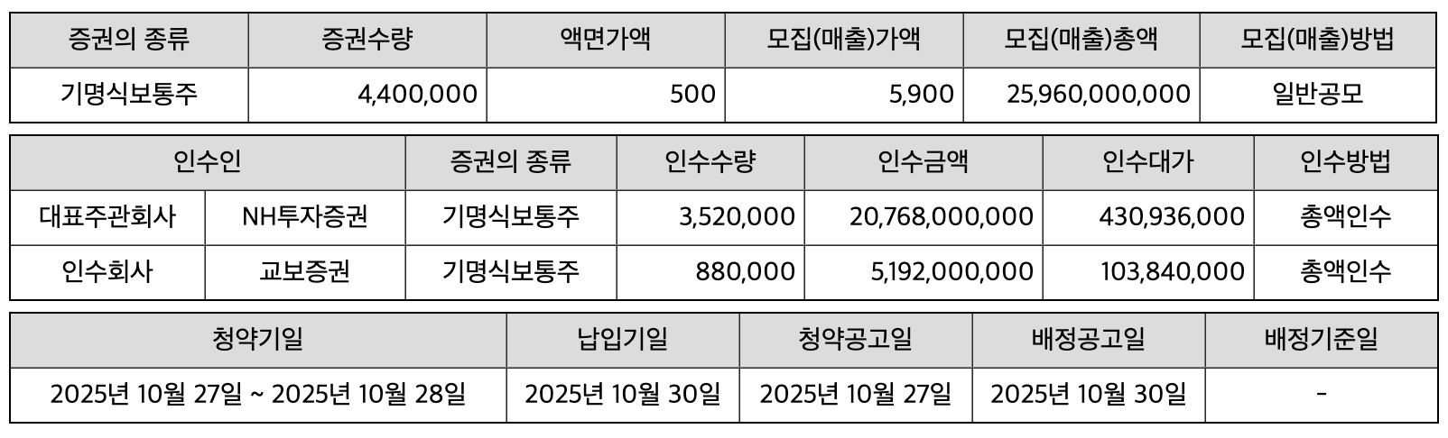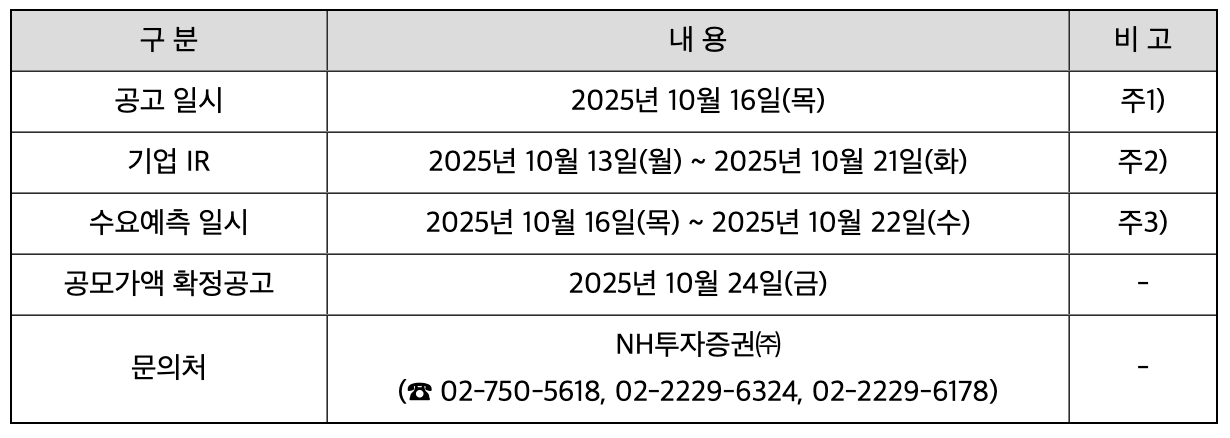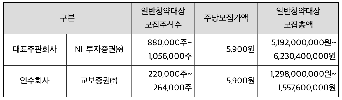 - 대표주관사: NH투자증권 / 인수사 : 교보증권