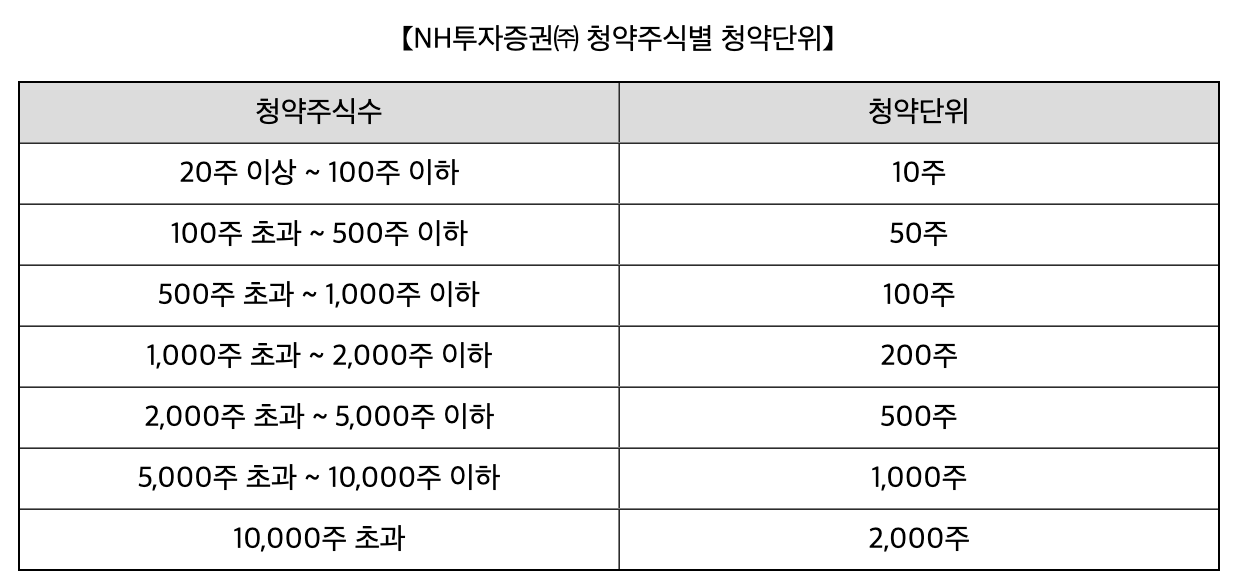 비츠로넥스텍 공모주 비례 배정을 고려한다면 체크해야 하는 사항 중에 하나는 청약 단위입니다. 최소 청약수량은 20주부터 가능하며, 이후 청약일정 마지막날에 경쟁률을 확인하시고 비례배정 1주당 필요한 금액을 청약단위와 함께 확인해야 합니다. 보통 대표주관사와 주관사가 필요한 청약 단위가 다를 때가 많은데, 비츠로넥스텍 공모주의 주관사 NH투자증권과 교보증권은 청약 단위가 같습니다.