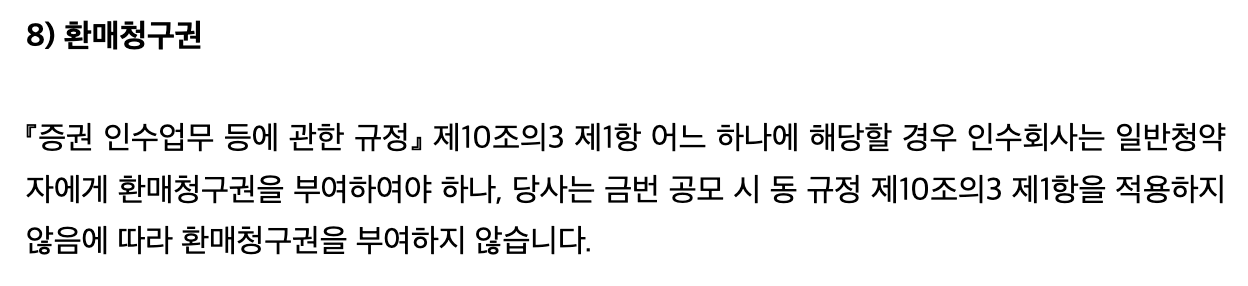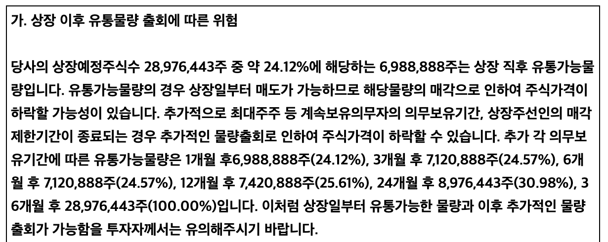 이외에 비츠로넥스텍 공모주 청약 시 알아두면 좋을 사항을 몇 가지 더 정리해 보도록 하겠습니다. 비츠로넥스텍 공모주는 환매 청구권이 없습니다. 청약한 공모주가 10% 이상 하락해도 손실을 그대로 받아들여야 합니다. 상장일에 유통 가능한 물량은 24.12%로 적당한 편입니다. 1개월 후에는 24.12%, 3개월 후에는 다시 24.57%, 36개월 이후에는 100% 유통 가능하니 매도 계획이 있으시다면 유통 일정을 확인하여 해당일에 주가 변동성이 있을 수 있다는 것을 유의하면 좋을 것 같습니다.