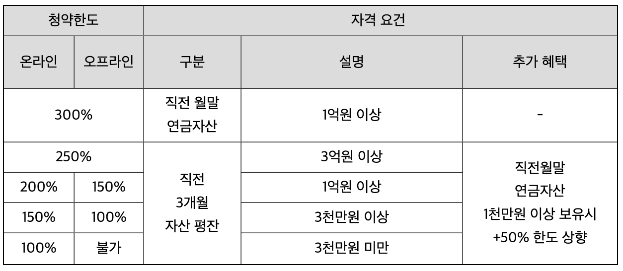 - 청약한도 150%: 직전 3개월 자산 평잔이 3천만 원 이상