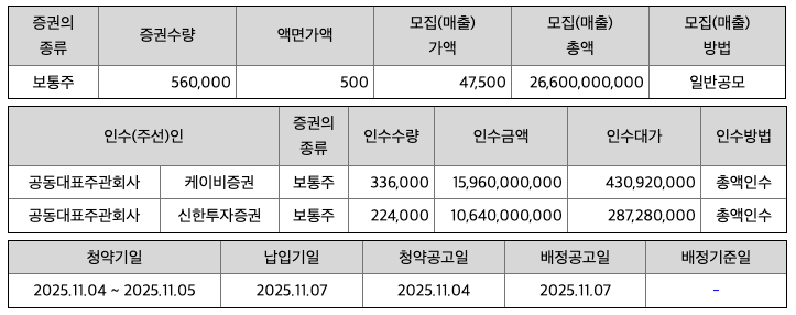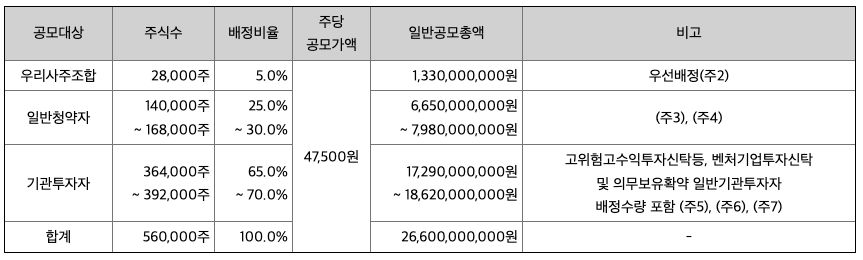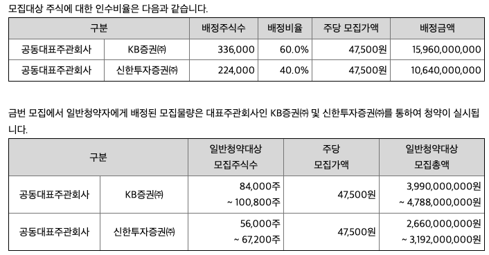 대표 주관사는 KB증권과 신한투자증권이 있습니다. 청약은 최소 20주부터 가능하며 최소 청약 금액은 47만 5천 원 ~ 56만 8천 원으로 예상되는데, 수요예측 결과에 따라 더 높아질 수도 있습니다. KB증권과 신한투자증권 모두 우대 고객 제도를 운영하고 있으니 더 많은 청약을 원하시는 경우 증권사별 고객 등급을 확인해 주시길 바랍니다. 상장 후 유통 가능 물량은 36.22%로 평균보다 약간 높은 수준이므로 상장일 단기 변동성에 유의할 필요가 있습니다.