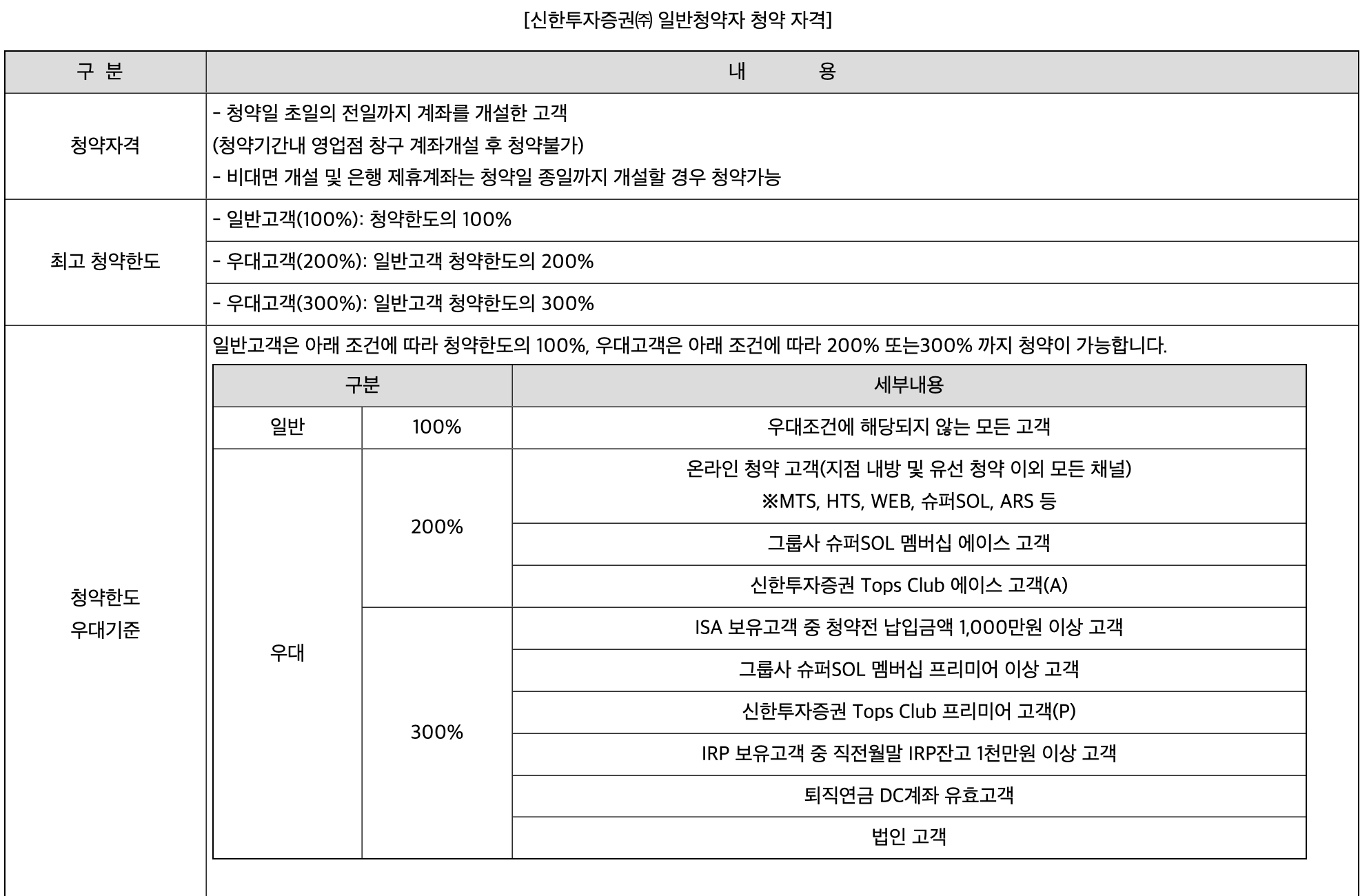 다음으로 신한투자증권입니다. 보통 배정받은 물량이 많은 경우에는 균등 배정이 유리하고, 사용자 수가 적은 증권사가 비례 배정에 유리한 모습을 보이기도 했는데 세나테크놀로지 공모주는 우선 배정된 비율의 차이가 크지 않고 KB증권과 신한투자증권 모두 유명한 증권사이기 때문에 섣불리 예상하기가 어렵습니다. 신한투자증권 역시 오프라인과 비대면 계좌 개설 자격 조건이 다르며, 우대 고객의 경우 청약 한도의 200~300%까지 청약이 가능합니다.