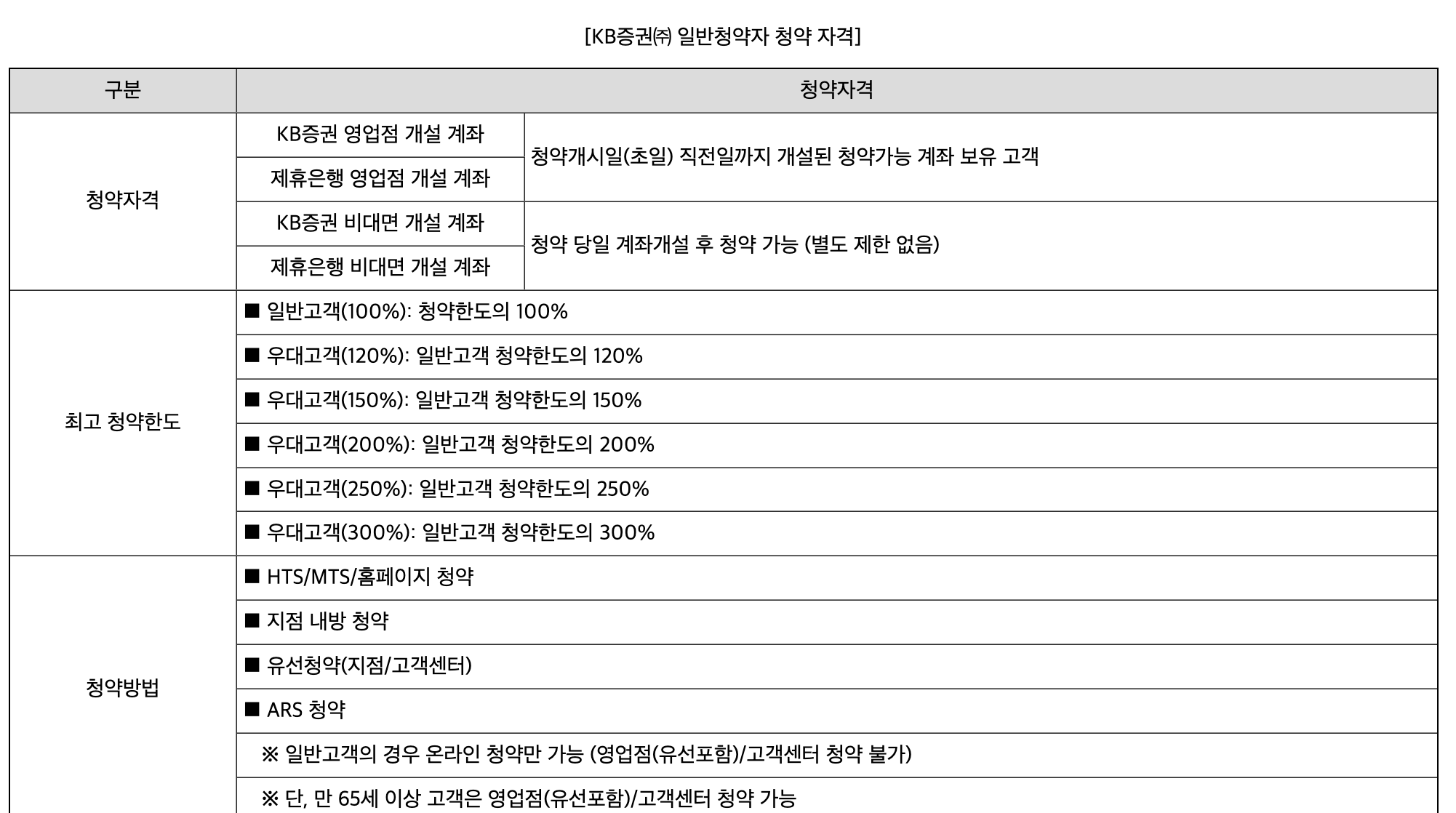 각 증권사마다 청약 자격이 조금씩 다르기 때문에 청약 전에 미리 살펴보는 것이 좋습니다. KB증권의 청약 자격은 영업점으로 계좌 개설을 한 경우에는 청약 전일까지 계좌 개설이 완료되어야 청약이 가능하며, 비대면 계좌 개설을 한 경우라면 별도 제한이 없습니다. 세나테크놀로지 공모주 규모가 큰 것으로 보아 사람들의 관심이 어느 정도 쏠릴 것으로 예상되는데요, 비례 배정 물량을 생각하고 계시다면 최고 청약 한도까지 체크해 두는 게 좋습니다. KB증권은 우대고객 기준에 따라 청약한도의 120%~300%까지 가능하니 참고해 주세요. 각 구분은 프라임클럽 가입 및 유지, 직전 자산 평잔 등 다양한 구분이 있으니 세부 내용은 KB증권을 통해 확인하시는 것이 좋을 것 같습니다.
