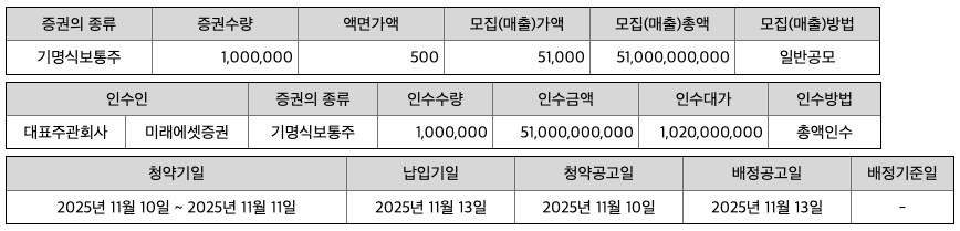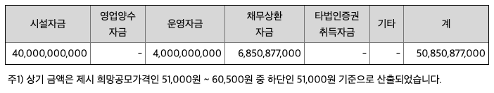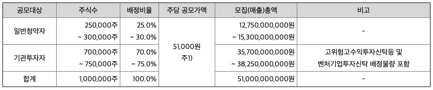 - 모집 총액: 51,000,000,000원 (공모가 51,000원 기준)