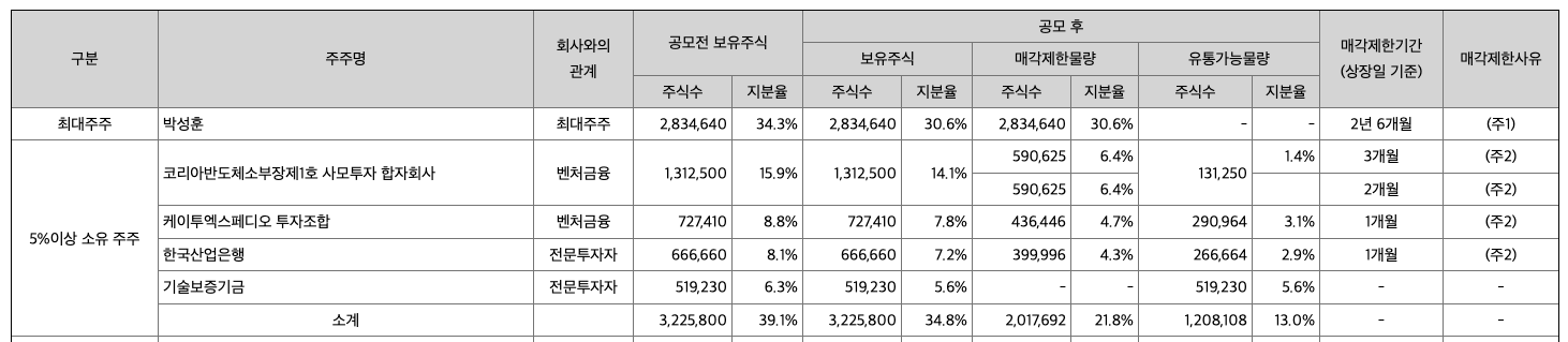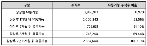 씨엠티엑스 공모주에 대한 대략적인 정보를 살펴봤다면 다음으로 확인이 필요한 정보는 상장 당일 유통 가능 물량입니다. 현재 나온 정보 기준으로 의무보유 주식 수를 제외한 상장 당일에 유통 가능한 주식 물량은 약 31.97%입니다. 다른 공모주 청약 상황때와 비교해 보면 보통 정도에 해당합니다. 최대 주주의 공모주 수량을 제외하고는 3개월 이내에는 주주들의 공모주(69.44% 비중) 매도 가능한 것으로 보이며 공모주 청약 시 참고하시길 바랍니다.