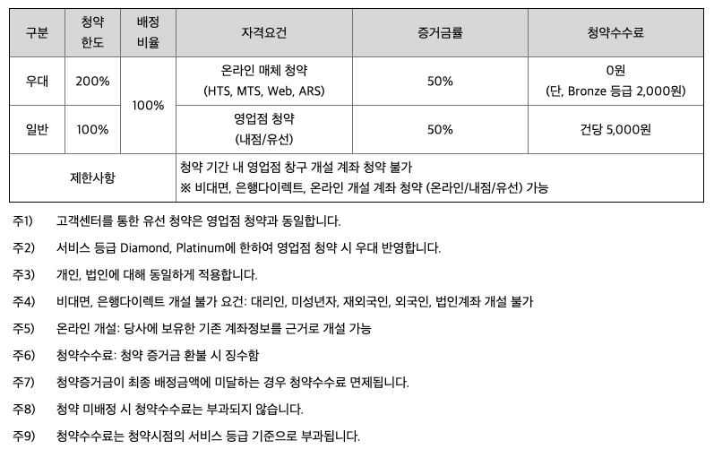 공모주 청약을 할 때 균등 배정을 하신다면 매번 다른 주관사마다 청약 조건이나 우대 고객 기준을 살피지 않아도 됩니다. 보통 균등 배정을 할 경우에는 최소 청약 주식수만 확인하면 됩니다. 하지만 비례 배정을 고려하고 있다면 청약 단위, 우대 고객 등급 기준을 확인하는 편이 좋으며 주관사가 두 곳 이상일 경우에는 청약 수수료도 확인하시면 좋습니다.