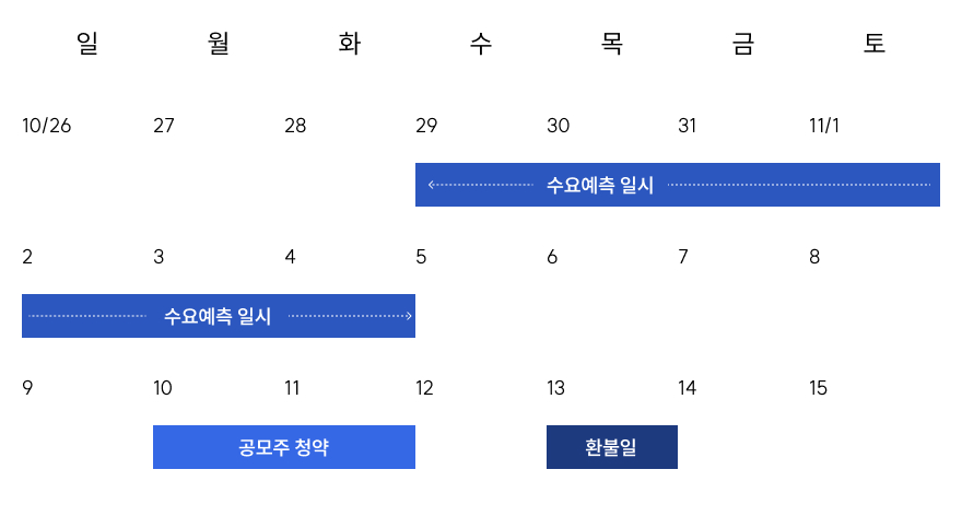 공모주 청약은 11월 10일부터 11일까지 미래에셋증권을 통해서 하실 수 있으며 온라인 매체로 청약하는 경우 최대 청약 한도의 200%까지 청약 가능할 예정입니다. 희망 공모가 밴드는 51,000원에서 60,500원으로 형성되어 있으며 최소 청약 수량 20주를 기준으로 최소 청약 증거금은 510,000원에서 605,000원이 필요합니다.