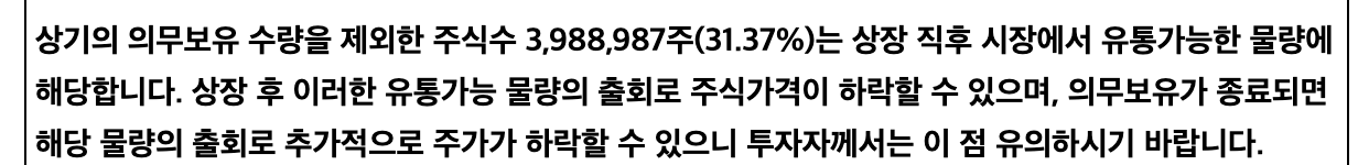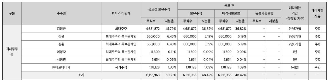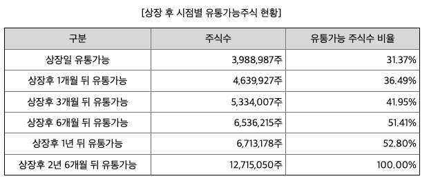 최대 주주의 주식은 2년 6개월 동안 매각 제한이 걸려있습니다. 다른 특수 관계인들은 몇 분을 제외하고는 1년 이후에 매도 가능합니다. 상장 당일에 판매하지 않고 조금 두었다가 판매하시는 분들도 있는 걸로 알고 있는데, 주요한 기점마다 시장에 주식수가 늘어난다는 것을 알고 있으면 위험에 대응하기 좋을 것 같습니다.