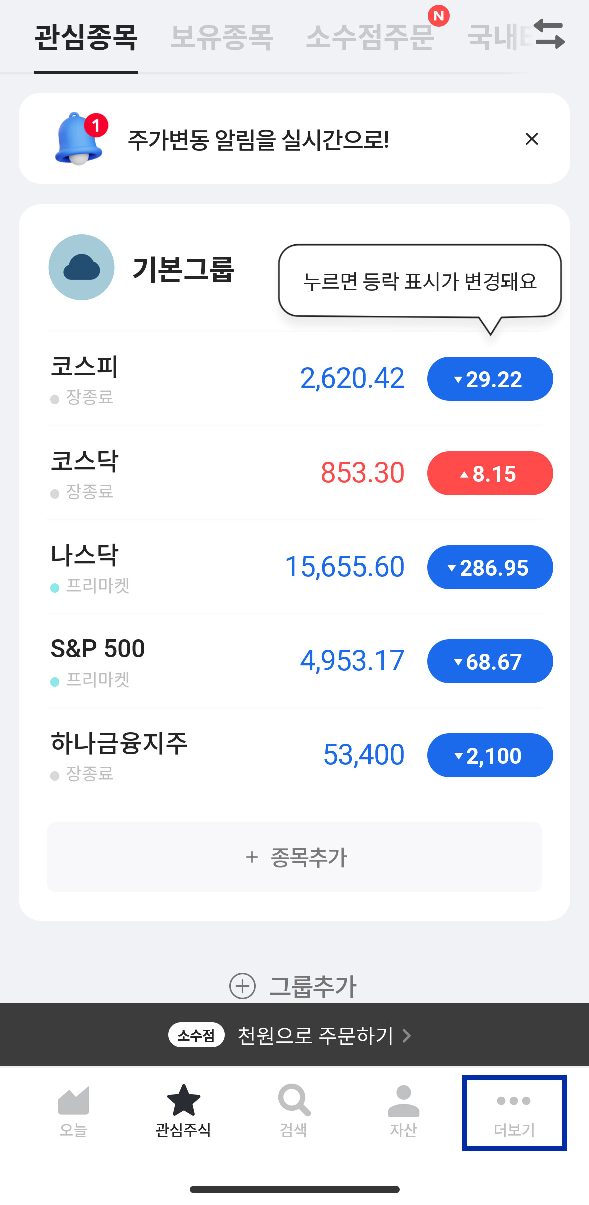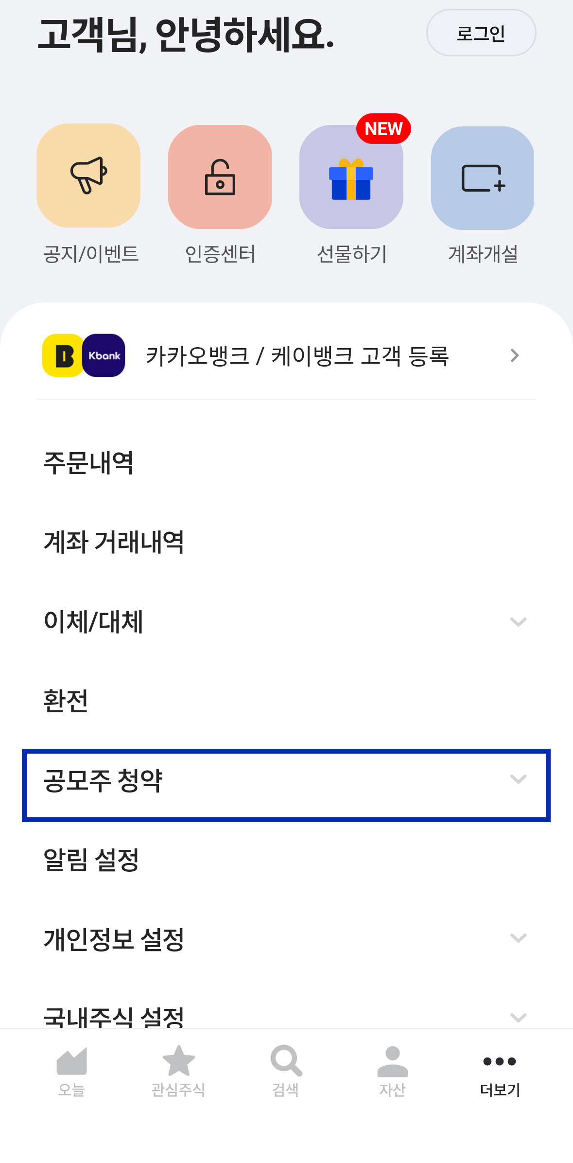 에이피알 공모주 공동 주관사였던 하나증권에서도 청약 경쟁률을 확인해 보겠습니다. 어플에 접속하셔서 메인 화면 가장 하단에 '더보기' 메뉴를 클릭합니다. 그리고 오른쪽 화면처럼 중간 아래쯤에 있는 '공모주 청약' 메뉴를 눌러주세요.