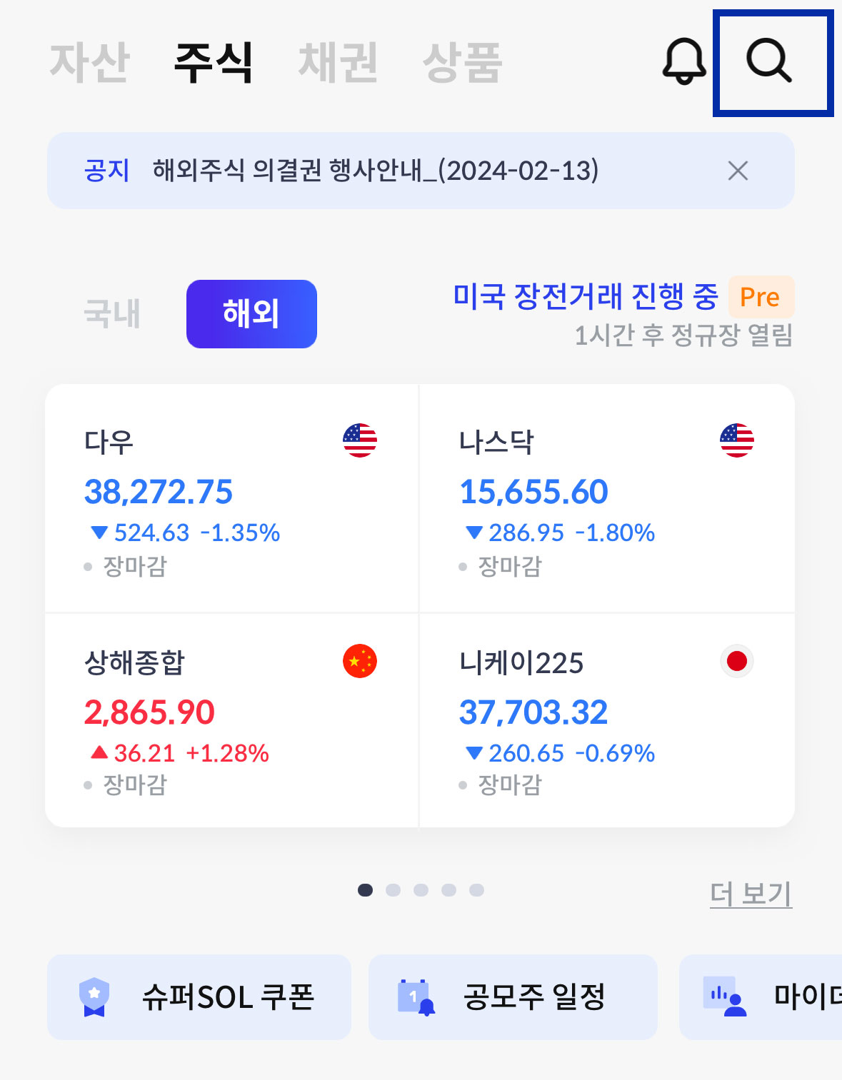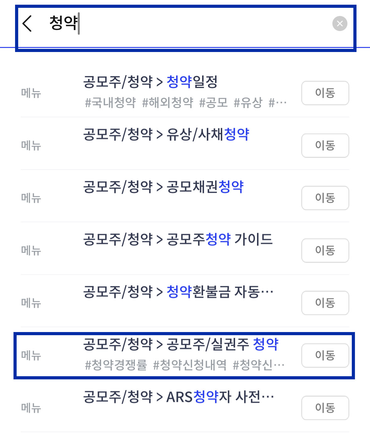 신한투자증권 증권사 어플에서 에이피알 공모주 청약 경쟁률을 확인하는 방법을 먼저 알아보겠습니다. 어플에 접속하면 가장 먼저 보이는 메인 화면 상단에 돋보기 아이콘을 클릭해 주세요. 그리고 검색창에 '청약'이라고 적으시면 하단에 '공모주/청약> 공모주/실권주 청약' 메뉴가 보입니다. 그 부분을 클릭하시면 됩니다.