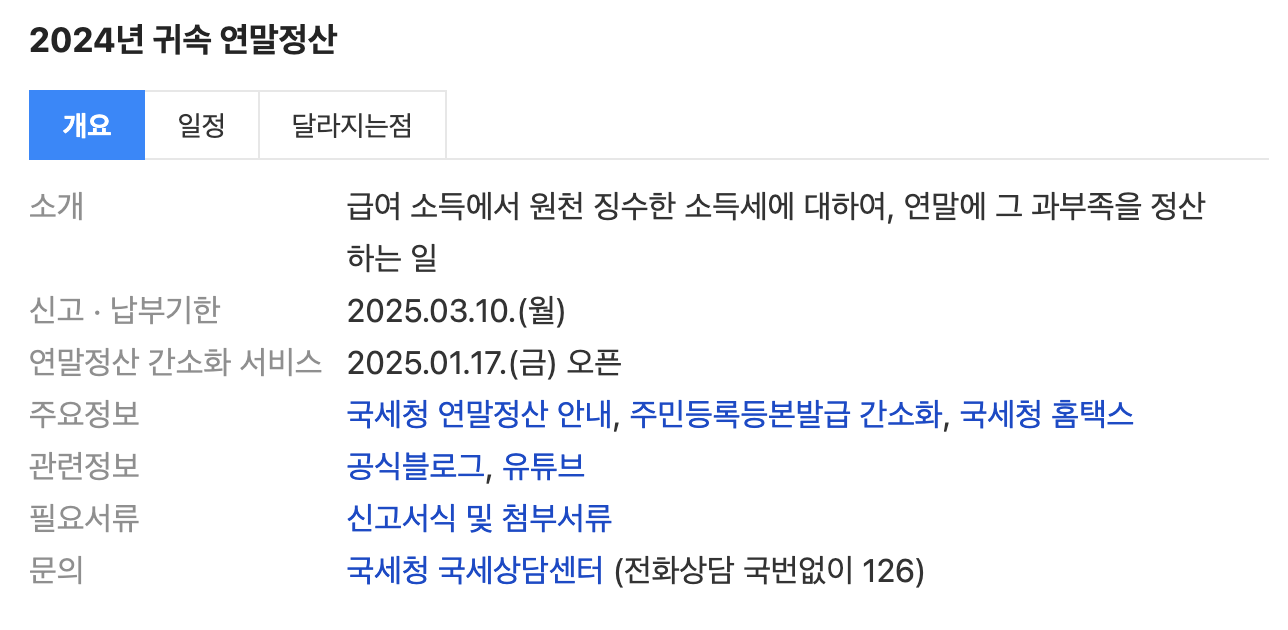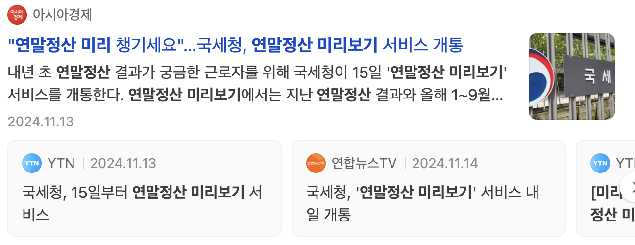 저도 마찬가지지만 세금이라는 단어만 들어도 머리가 아프신 분들 많으실 것 같습니다. 그래서 예전에 비해 연말 정산이 많이 간소화되었습니다. 또한 연말정산 미리보기를 통해 꼭 정산 기간이 아니더라도 사람들이 미리 어느 정도 돈을 더 내야 하는지, 받는지 미리 확인할 수 있도록 돕고 있습니다. 회사마다 공지가 올라오는 날짜는 다르지만, 보통 1월 중순부터는 경영관리팀에서 연말 정산에 필요한 서류들을 하나씩 안내해 줍니다. 내년 연말 정산 신청 기간이 언제부터인지 찾아보니 2025년 1월 17일부터 확인할 수 있다고 합니다.