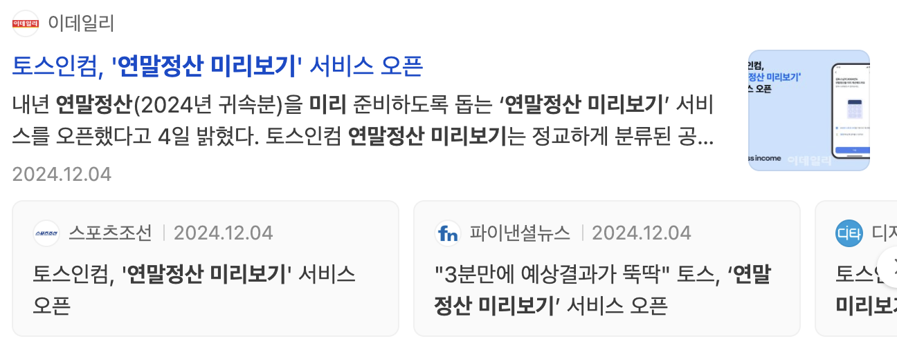 연말정산은 그럼 어디서 먼저 확인할 수 있을까요? 연말정산 미리보기 서비스를 활용해서 2024년 공제 항목과 공제 한도를 파악하고 세금을 미리 계산할 수 있습니다. 그 외에도 여러 가지 팁들을 제공하기도 합니다. 기사를 검색해 보니까 연말정산 미리보기 서비스를 제공하는 곳은 국제청과 토스인컴이 있었는데, 아무래도 국세청 홈택스 서비스를 살펴보는 것이 좋을 것 같아서 그 부분을 정리해 보도록 하겠습니다.