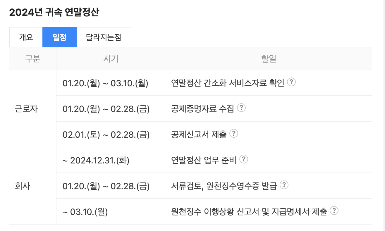자세한 일정에 대해서도 살펴볼 수 있었는데, 회사는 올해까지 연말정산 업무를 준비하고 1월 20일부터 2월 말까지 서류 검토 및 원천징수영수증을 발급합니다. 근로자는 1월 20일부터 간소화 자료를 확인할 수 있으며 2월부터 신고서를 제출할 수 있다고 합니다.