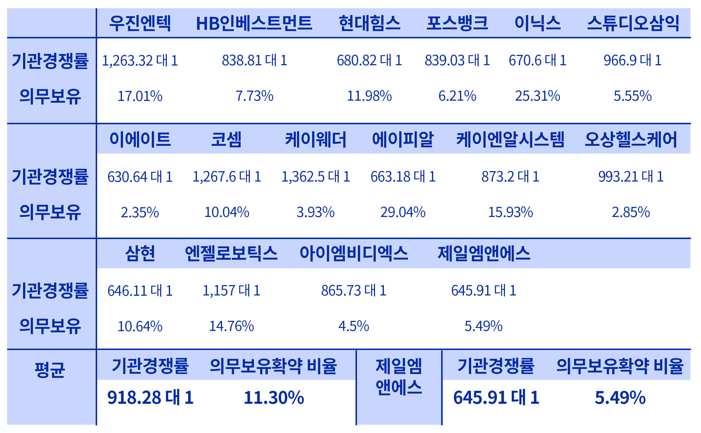 제일엠앤에스 경쟁률을 올해 진행되었던 공모주 청약과 비교해서 살펴보도록 하겠습니다. 제일엠앤에스 경쟁률은 약 646대 1로 이전까지 있었던 공모주 경쟁률 평균값과 비교해서는 낮은 편입니다. 의무보유 확약 비율 역시 5.49%로 평균에 비해 낮은 수치를 기록하였습니다.
