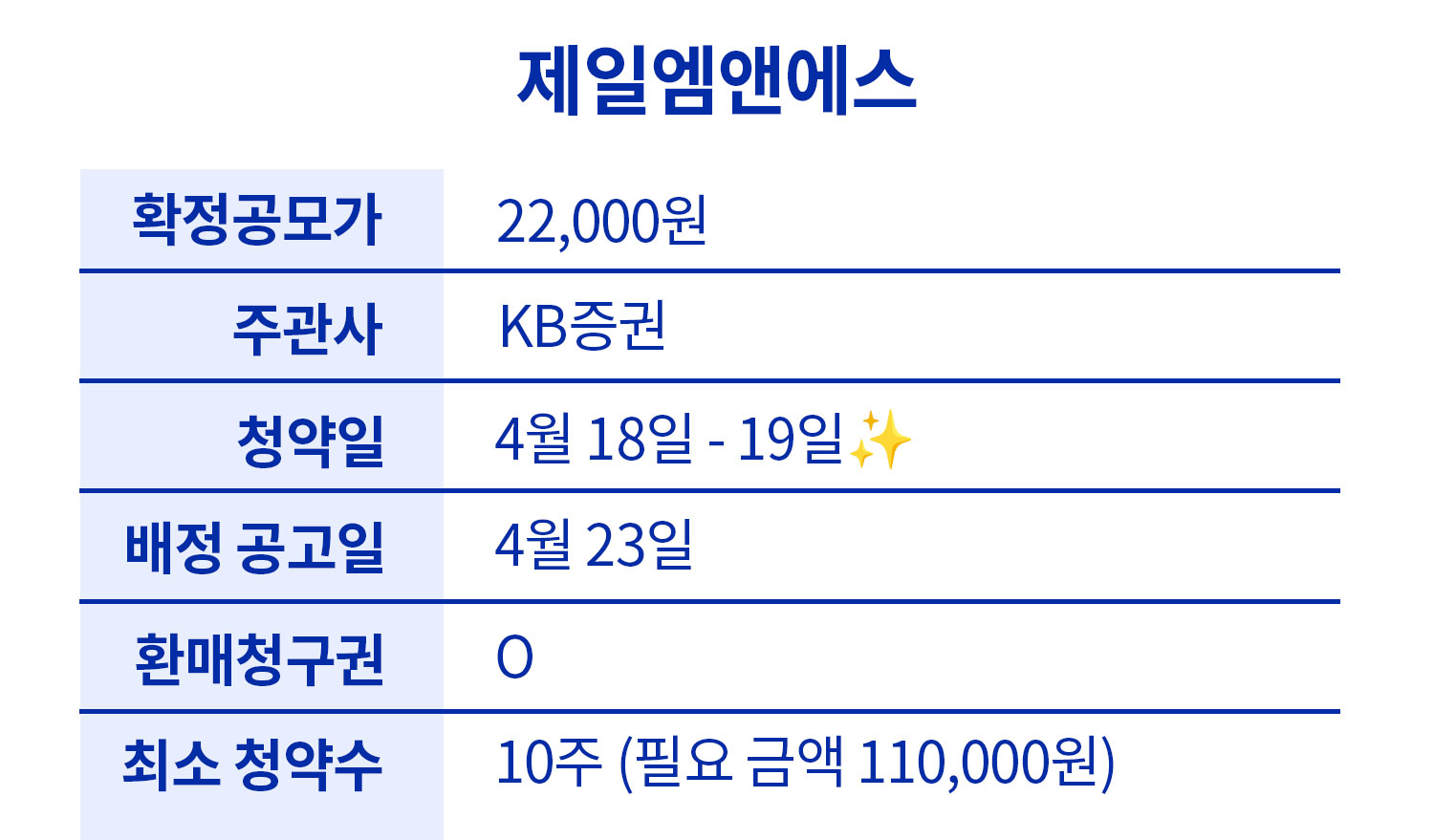 제일엠앤에스는 18일인 오늘부터 내일까지 이틀간 공모주 청약을 하실 수 있으며, 주관사는 Kb증권입니다. 확정 공모가는 희망 공모가 밴드를 초과한 22,000원으로 결정되었으며 최소 청약수는 10주입니다. 이에 따라 균등 배정 물량을 노리신다면 최소 110,000원이 청약 증거금으로 있어야 합니다.