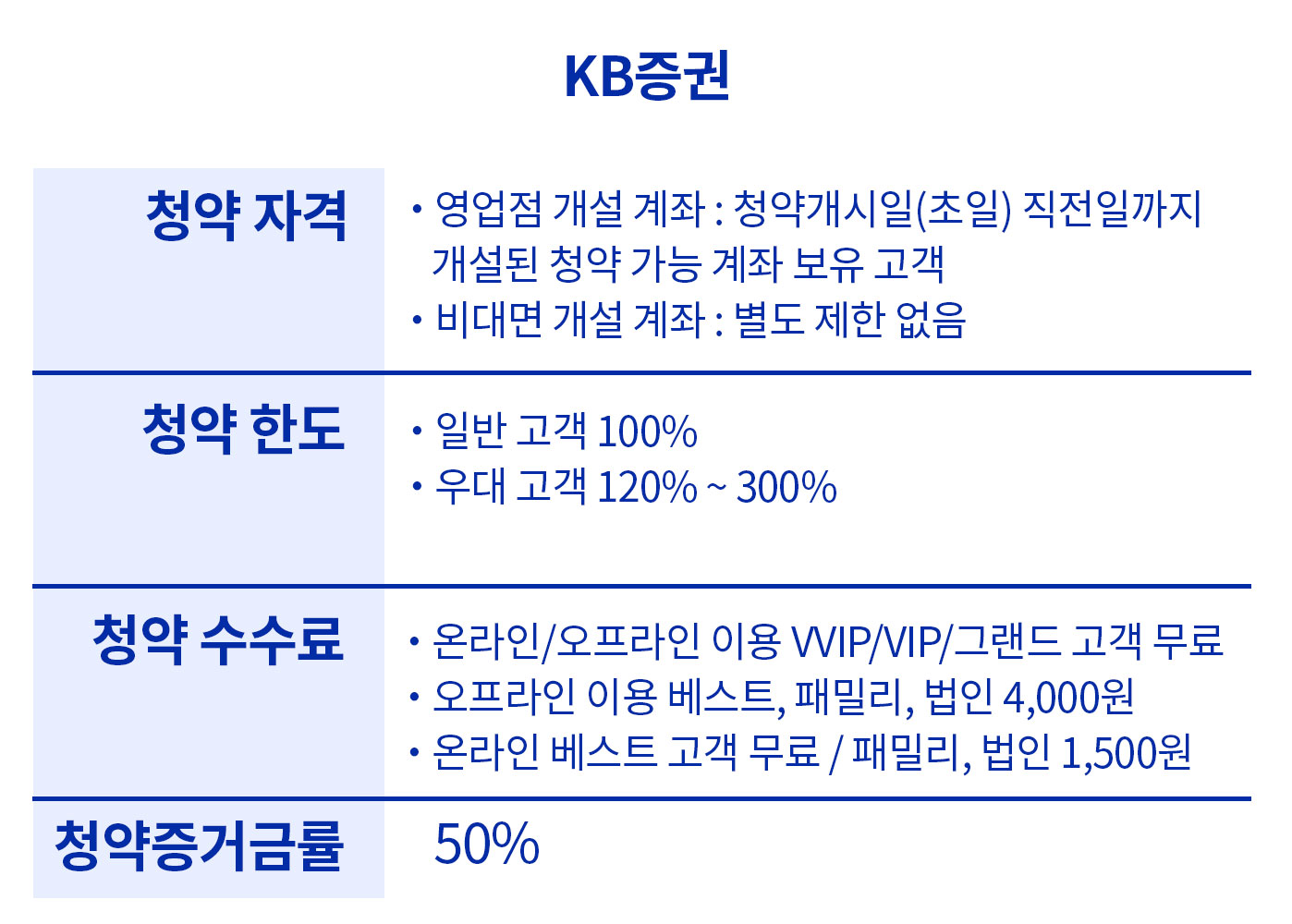 우대고객 120% 청약까지 하시고 싶은 분이라면 프라임클럽 가입을 하시고 유지를 하는 등의 조건이 있으니 세부적인 사항은 KB증권 측으로 물어보시는 편이 좋을 것 같습니다. 청약 증거금은 일반 고객 및 우대 고객은 모두 50%가 필요합니다. 청약 한도 끝까지 하신다면 일반 고객은 2억 2천만 원에서부터 우대 300%는 6억 6천만 원이 필요합니다. 청약 주식별로 청약 단위가 다르므로 청약 전에 확인하시는 편이 좋습니다.
