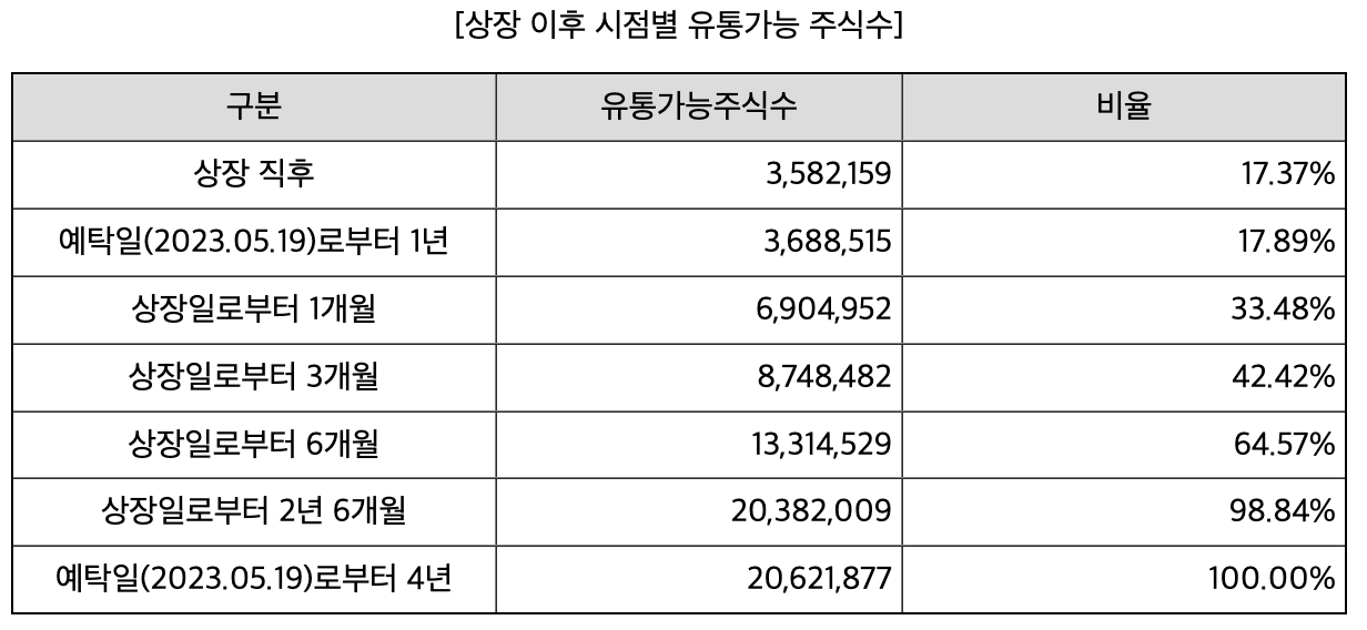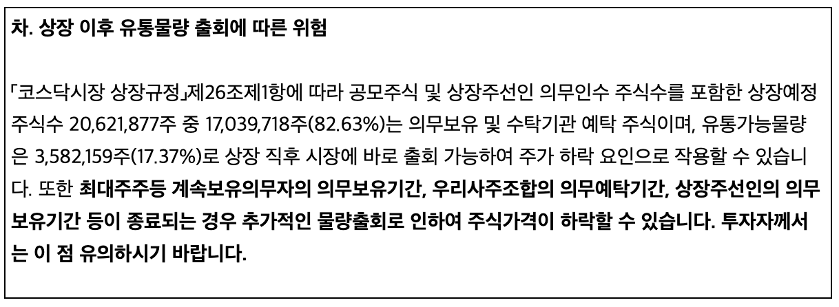 제일엠앤에스의 상장일 유통 가능 물량은 17.37%입니다. 1개월 이후에는 두배 정도인 33.48%, 3개월 이후에는 더 많은 물량이 시장에 유통 가능한 물량으로 변경됩니다. 환매 청구권이 3개월간 유효하기 때문에 오래 갖고 계시는 분들이 계실 것 같은데, 유통 가능한 물량이 늘어나면 그만큼 시장에 나온 주식 물량이 많다는 이야기이기 때문에 가격 변동에 유의하셔야 합니다.