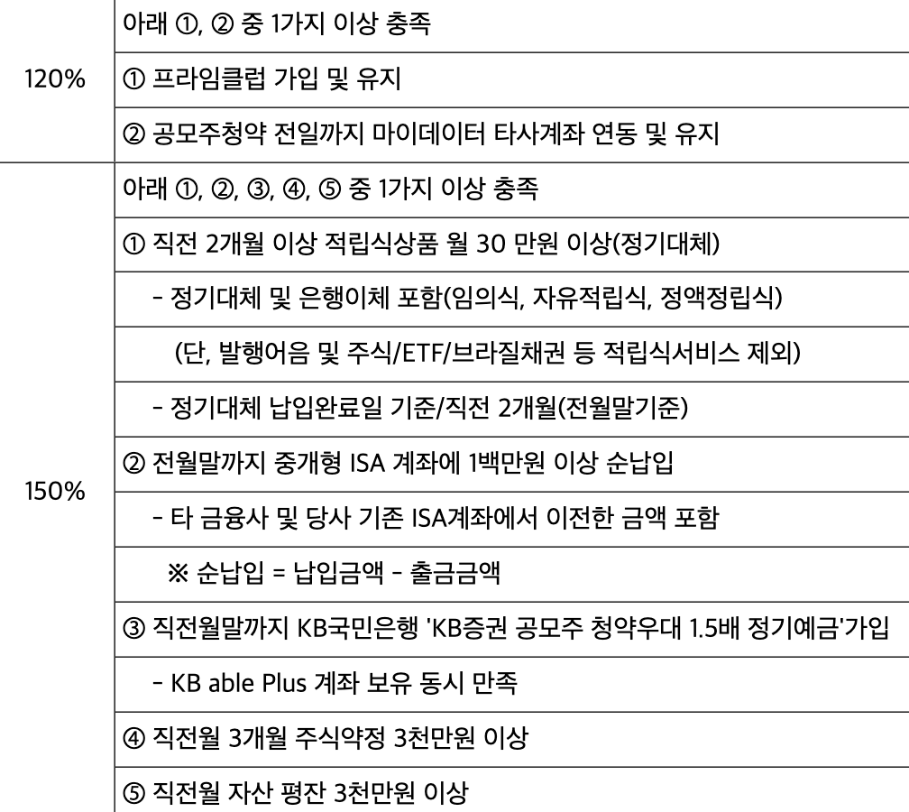 균등 배정을 목적으로 청약하시는 경우에는 최소 청약수만 맞추면 되지만 더 청약을 원하시는 경우에는 우대 고객 기준을 확인하시는 편이 좋습니다. 120% 우대 고객까지는 청약일 전까지 만들어놓을 수 있기 떄문입니다. 제일엠앤에스 공모주 120% 청약을 원하신다면 프라임클럽 가입 고객이거나 청약 전까지 마이데이터 타사 계좌를 연동하셔야 합니다.