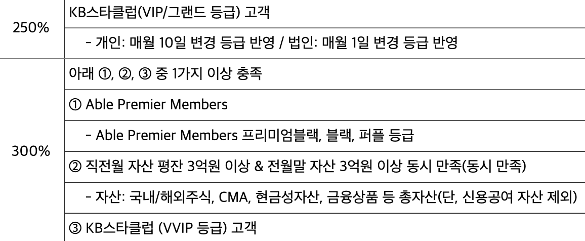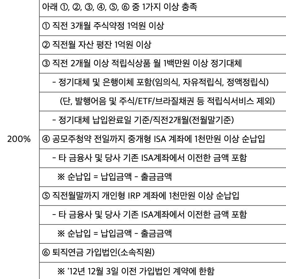 일반 고객은 청약 한도의 100%까지 가능하며 우대고객은 일반 고객 대비 최소 120% ~ 300%까지 청약이 가능합니다. 우대 고객 기준을 자세히 살펴보도록 하겠습니다.