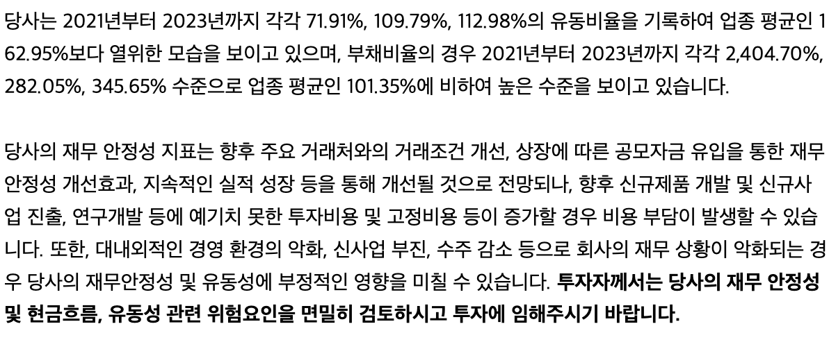 전자공시에는 투자 위험 요소까지 꼼꼼하게 나와있습니다. 몇가지 살펴보도록 하겠습니다. 제일엠앤에스 공모주는 업종 평균(약 101%)보다 높은 부채 비율인 345.65%(23년 기준)을 갖고 있습니다. 공모자금 유입을 통해 이는 해소될 수 있지만 연구개발비 증가 및 고정 비용의 상승에 따라 부채 비율이 상승할 수 있습니다.
