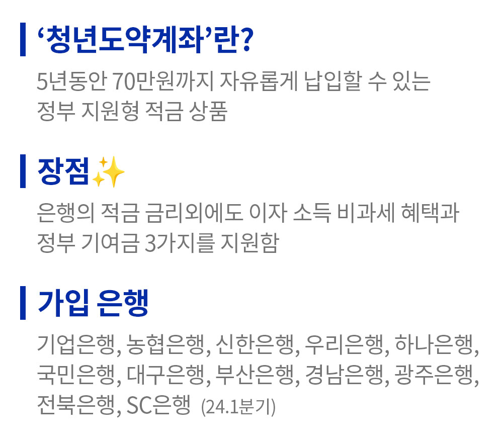 청년도약계좌란 쉽게 이야기하자면 정부에서 지원하는 중장기형 적금 상품입니다. 일반 시중 은행에서 가입하는 적금과 다르게 이자 소득에 대해 비과세 혜택도 지원하고 정부에서 기여금도 지급하기 때문에, 시중 금리보다 높은 것이 가장 큰 장점입니다.