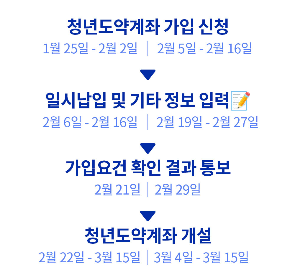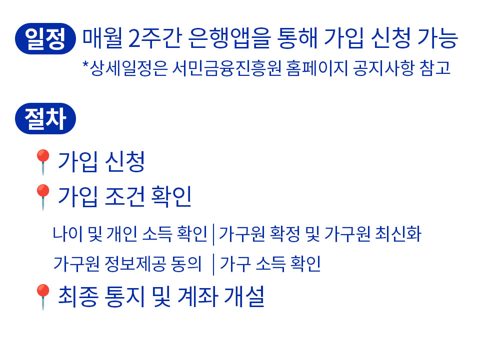 매월 1-2주간 은행앱을 통해서 청년도약계좌 가입 조건에 해당하는 사람을 대상으로 신청을 받고 있으며, 이후 서민금융진흥원에서 조건이 맞는지 확인을 합니다. 청년도약계좌 가입 조건에는 나이 및 소득, 가구원이 중요한데요, 따로 서류를 제출할 필요가 없이 전산으로 확인합니다. 혹시 확인 중에 전산 정보만으로 확인이 어려운 경우에 서류 제출을 요구할 수도 있습니다. 병역 이행 기간을 확정해야 하는 경우, 육아 휴직 급여 및 육아 휴식 수당을 수령받으신 분 등이 있습니다.
