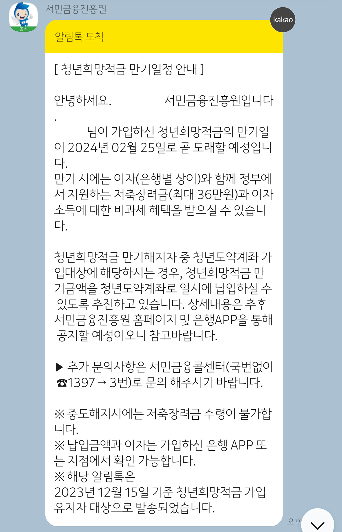 2022년 2월에 시작되었던 청년희망적금 만기일이 다가오면서 다음 적금은 어떤 것을 들어야 할지 고민이 됩니다. 저도 자동 이체로 해놓고 만기까지 모두 납입을 완료하였는데, 2년이라는 시간이 꽤 길게 느껴졌던 것 같습니다. 작년 12월 말쯤에 만기 관련 안내 알림톡이 왔었는데, 그때 그 메시지를 보고 조금 뿌듯했던 기억이 납니다.