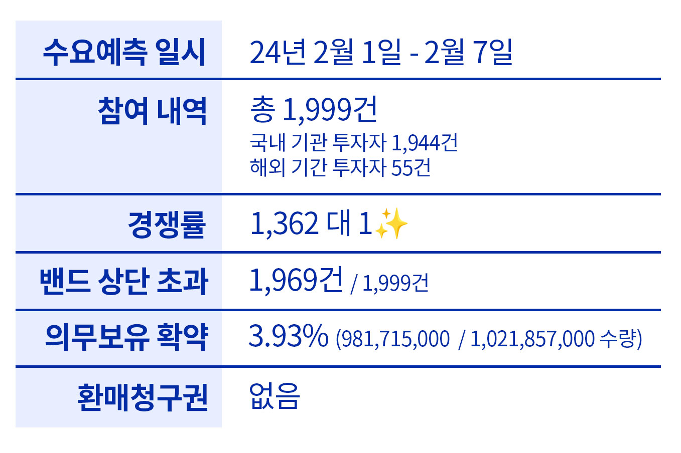 지난 2월 1일부터 7일까지 수요예측 모집이 있었습니다. 총 1,999건이 참여하였으며 이중 국내 기관 투자자는 1,944건, 해외 기관 투자자가 55건입니다. 참여한 투자자 중 대부분이 희망 공모가 밴드 상단을 초과하는 금액을 제시하여 제출하였습니다.