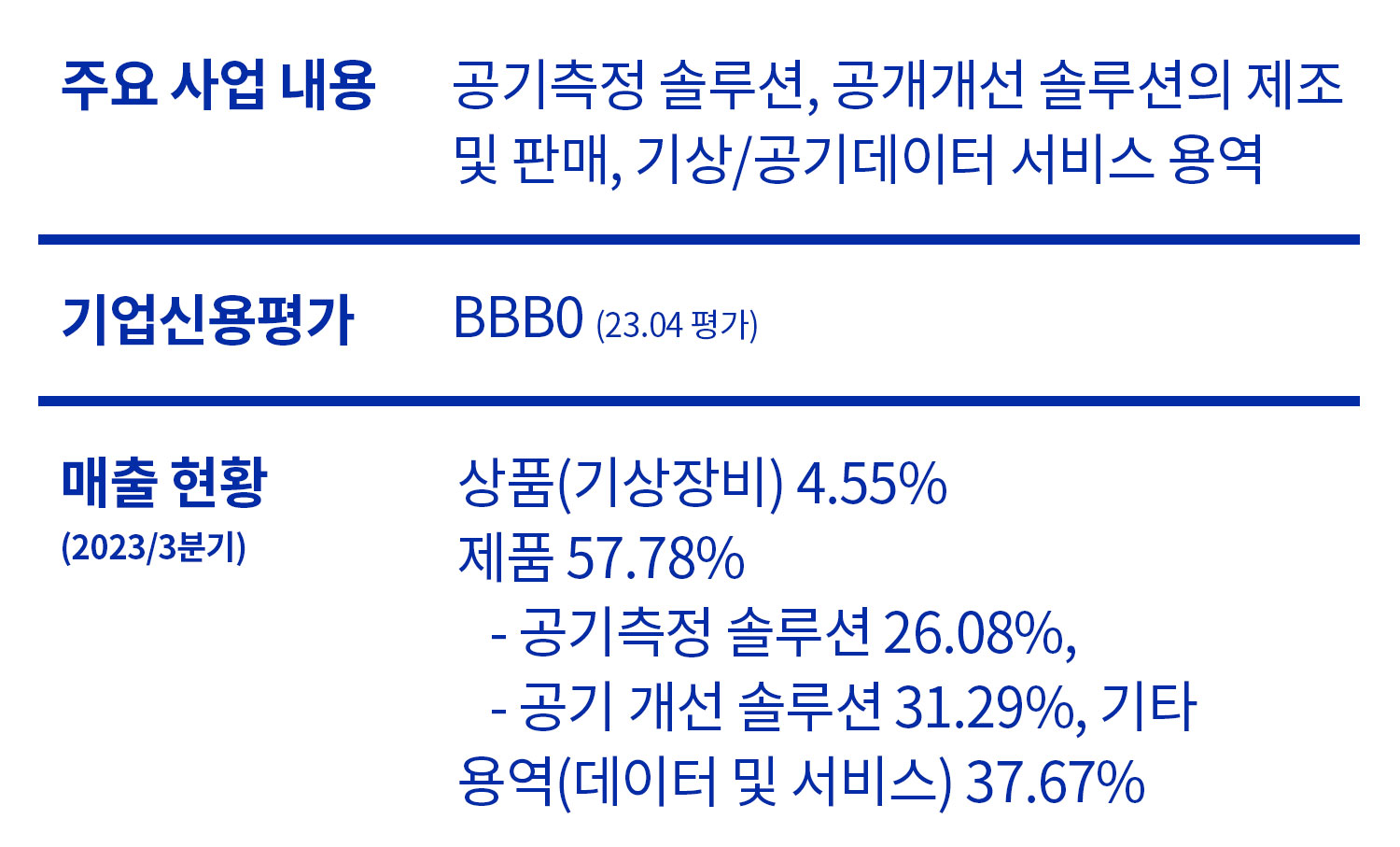 케이웨더 공모주는 국내 최대 민간 기상 사업을 하고 있는 기업입니다. 날씨와 관련된 빅데이터 플랫폼을 활용하여 사람들로 하여금 날씨로 발생할 수 있는 리스크를 줄여주는가 하면 삶의 질을 높여주는 것을 목표로 한다고 합니다. 주요 제품으로는 '공기 측정 솔루션', '공기 개선 솔루션', '기상 장비', '데이터 및 서비스 제공' 등이 있습니다.