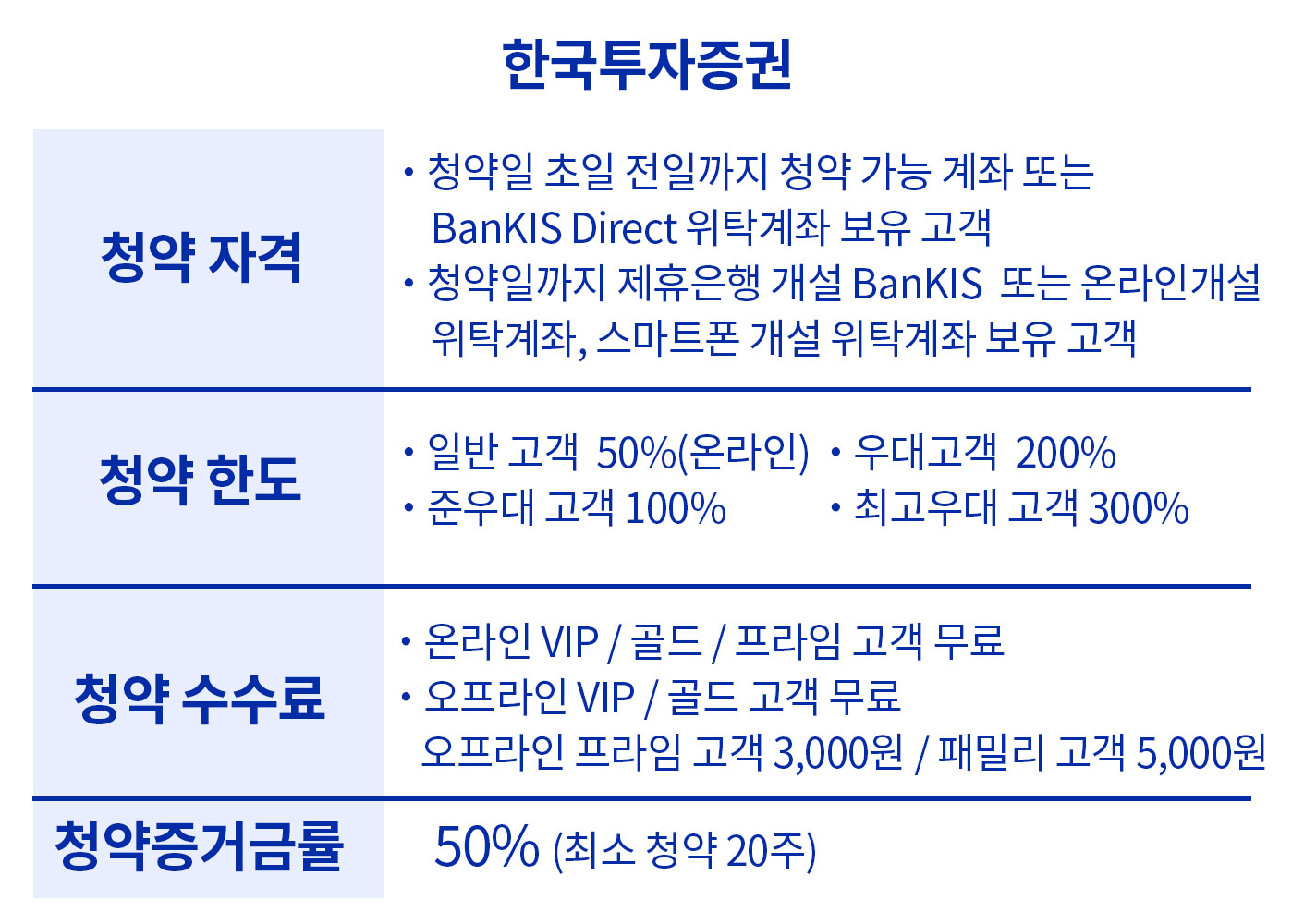 청약 한도는 온라인 고객은 50%까지 가능하며, 준우대고객은 100%(12,000주), 우대 고객은 고객 등급에 따라 200%~300%까지 가능합니다. 청약 수수료도 고객 등급별, 온라인에서 했는지 오프라인에서 청약하였는지에 따라서 수수료가 다르게 책정됩니다.