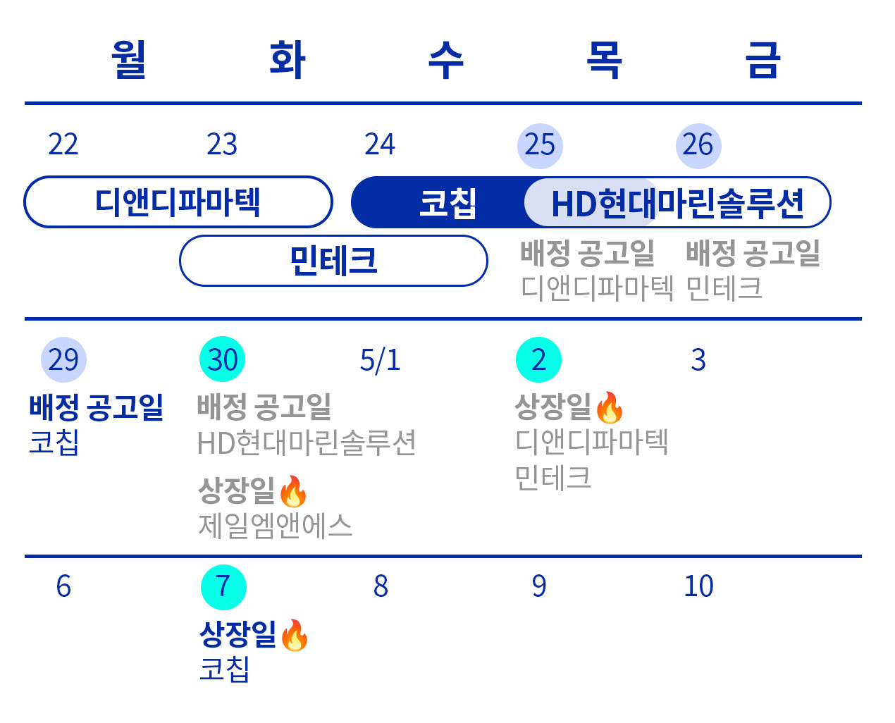다른 일정과 함께 파악할 수 있도록 정리한 코칩 공모주 일정입니다. 청약일과 환불일에 유의하여 청약하시고 상장 예정일을 확인 바랍니다.